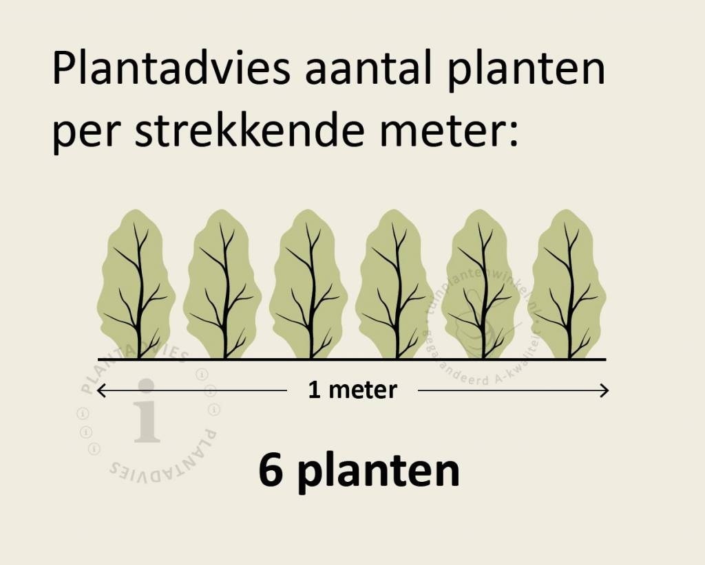 | Maatvoering (in cm.) | Aantal per strekkende meter (enkele rij) | Aantal per strekkende meter (dubbele rij) | Potmaat |