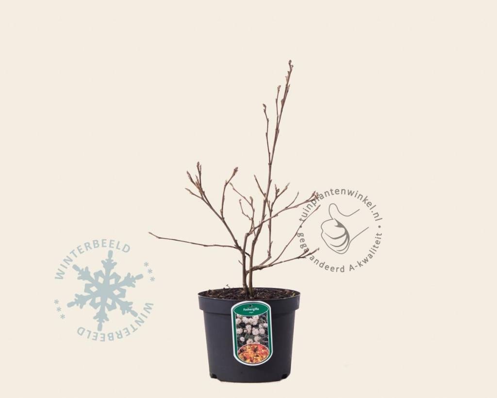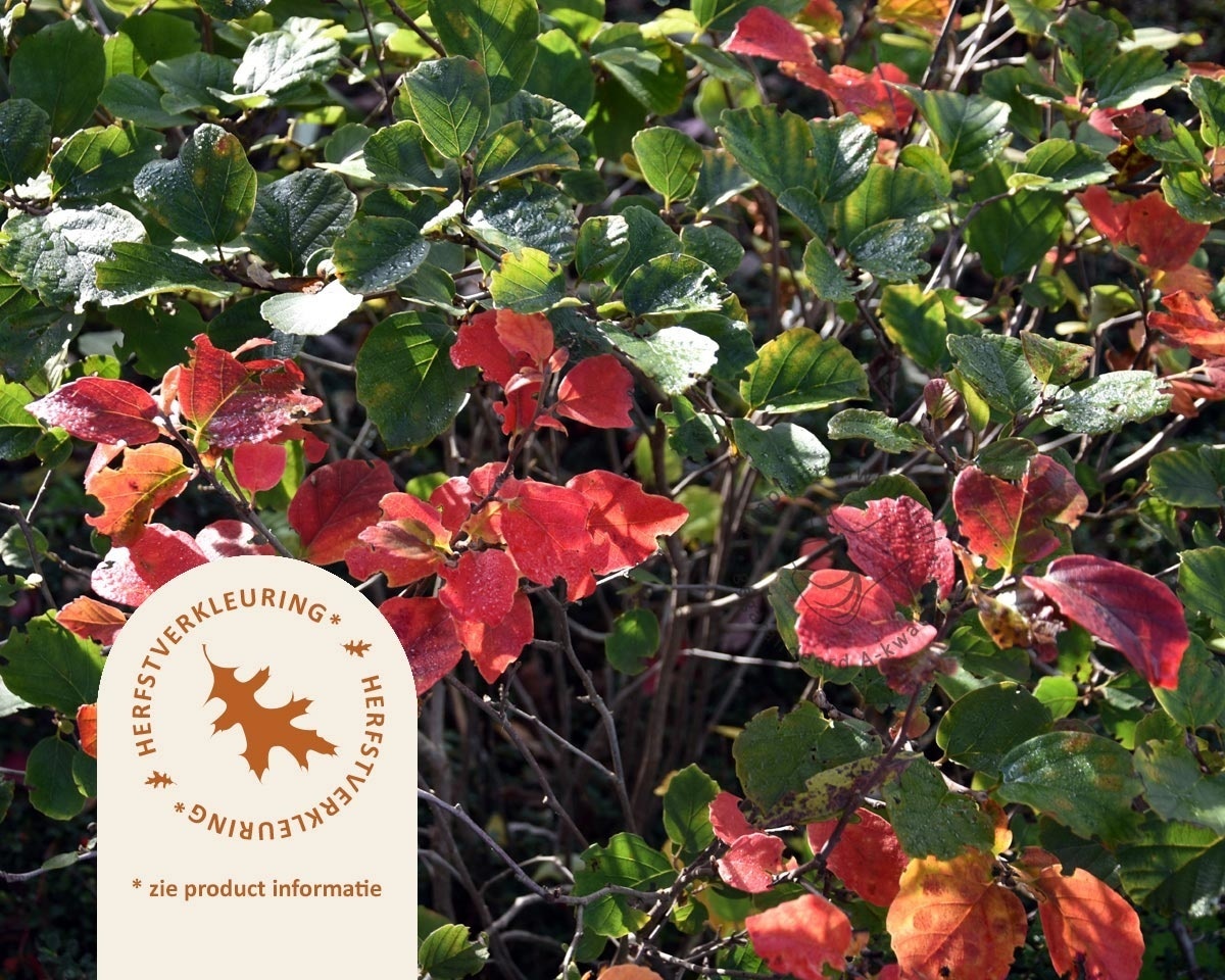 Het blad van deze heester verkleurt in het najaar. De kleuren op de foto geven een indicatie van deze verkleuring. De exacte verkleuring is afhankelijk van de standplaats en het weer en kan per jaar verschillen. Het is dus niet zeker of u de verkleuring zoals deze gefotografeerd is, ook elk jaar terugziet in uw tuin. Aan de kleuren die op deze foto zichtbaar zijn, kunnen geen rechten worden ontleend.