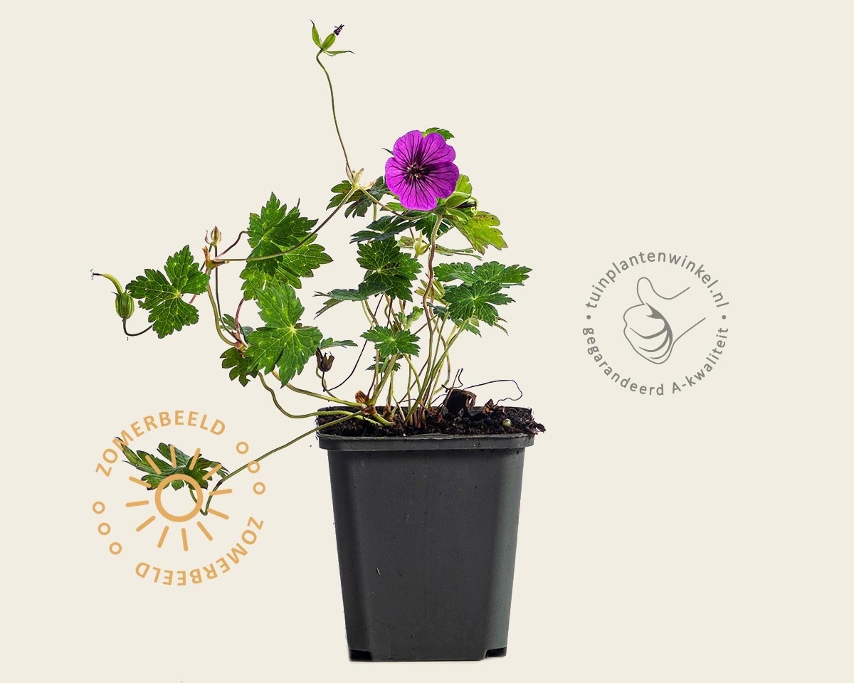 Deze doorbloeiende soort Geranium is zeg maar het roze bloeiende zusje van de bekende Geranium 'Rozanne'. De bloei duurt net zo lang en de plant heeft dezelfde spreidende groeiwijze. De roze bloemen hebben prachtige donker aders. In het najaar sterft het bovengrondse deel van de plant af. Haal de verdorde plantdelen weg aan het einde van de winter. Hierna zal de plant opnieuw uitlopen.
