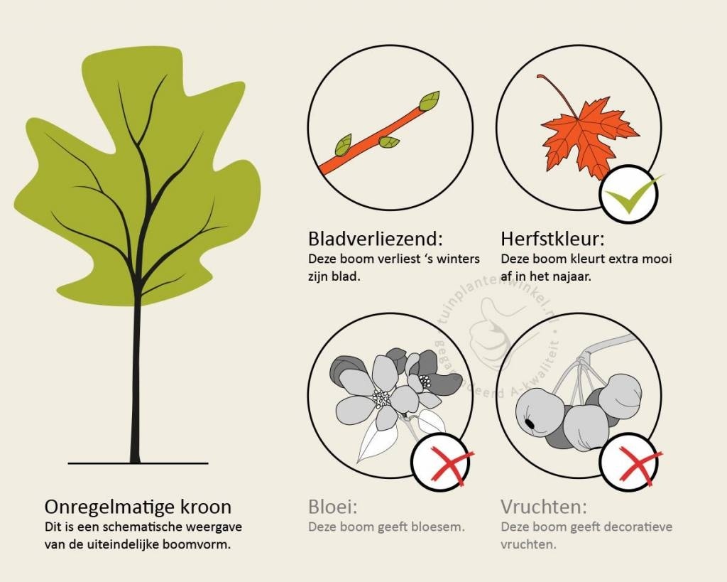 Bomen van Tuinplantenwinkel.nl kunt u jaarrond planten. Dit kan omdat we al onze bomen in pot leveren. Aanplanten in de herfst, winter, lente én zomer is dus altijd mogelijk, met aangroeigarantie!