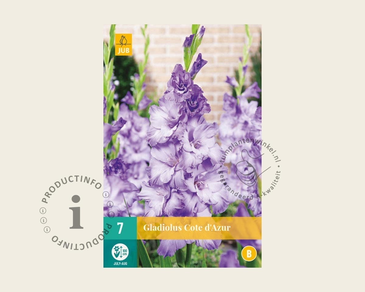 De Gladiolus 'Cote d'Azur' is een oogstrelende verschijning in elke tuin of bloemarrangement. Deze prachtige gladiool, met zijn levendige blauwe en soms lichtpaarse bloemen, brengt de sfeer van de Franse Rivièra in uw tuin. Met zijn indrukwekkende hoogte van ongeveer 100-120 cm, is deze bloem een opvallend en elegant element in elke bloemenborder of als snijbloem in boeketten.