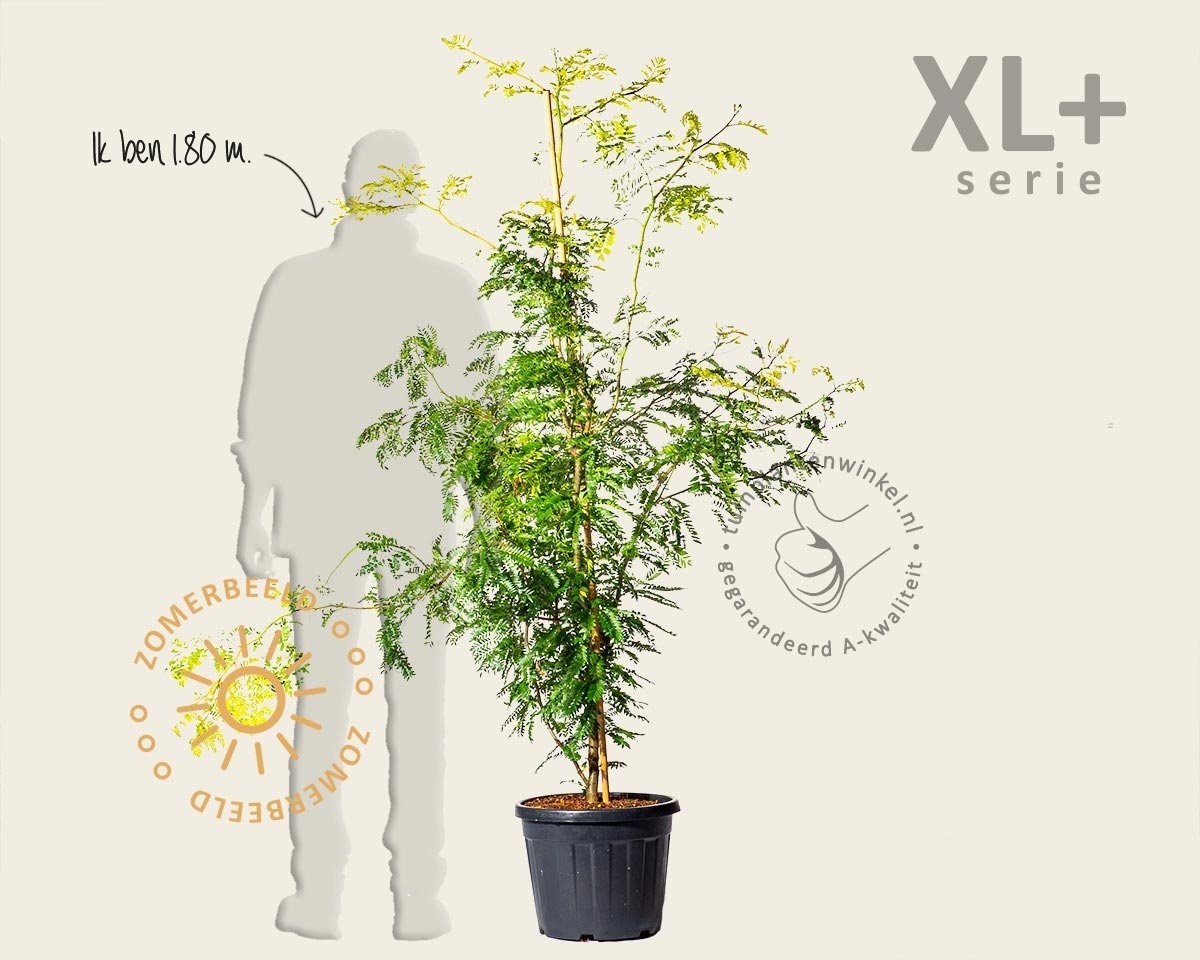 Het blad van de Gleditsia triacanthos ‘Sunburst’ - XL+ verandert naarmate het blad ouder wordt. In het voorjaar, als het blad tevoorschijn komt, is het felgeel van kleur. Vervolgens zal het groen/geel verkleuren, waardoor de struik minder opvalt in de tuin. In de herfst zal al het blad uiteindelijk weer geel worden, waarna het van de tuinplant valt. In het voorjaar komen de onopvallende, geelwitte bloemtrosjes tevoorschijn, die soms uitgroeien tot lange, zwarte peulen.
