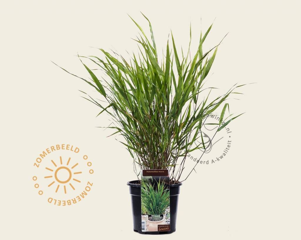 Hakonechloa macra is een bijzondere grassoort met frisgroene, bamboeachtige, overhangend blad.. In het najaar verkleurt het blad van dit siergras naar roodbruin. Japans berggras is geen bamboe en woekert dus niet. Japans siergras is goed winterhard en staat mooi als rand langs of als groep in de border, waar de afzonderlijke pollen langzaam een geheel vormen, maar voldoet ook uitstekend als solitair in een pot op het balkon of terras. De uiteindelijke hoogte ligt tussen de 20 en 40 centimeter. Japans siergras kun je goed combineren met andere vaste planten. Hakonechloa macra japans is een snelle groeier en vormt nieuwe scheuten