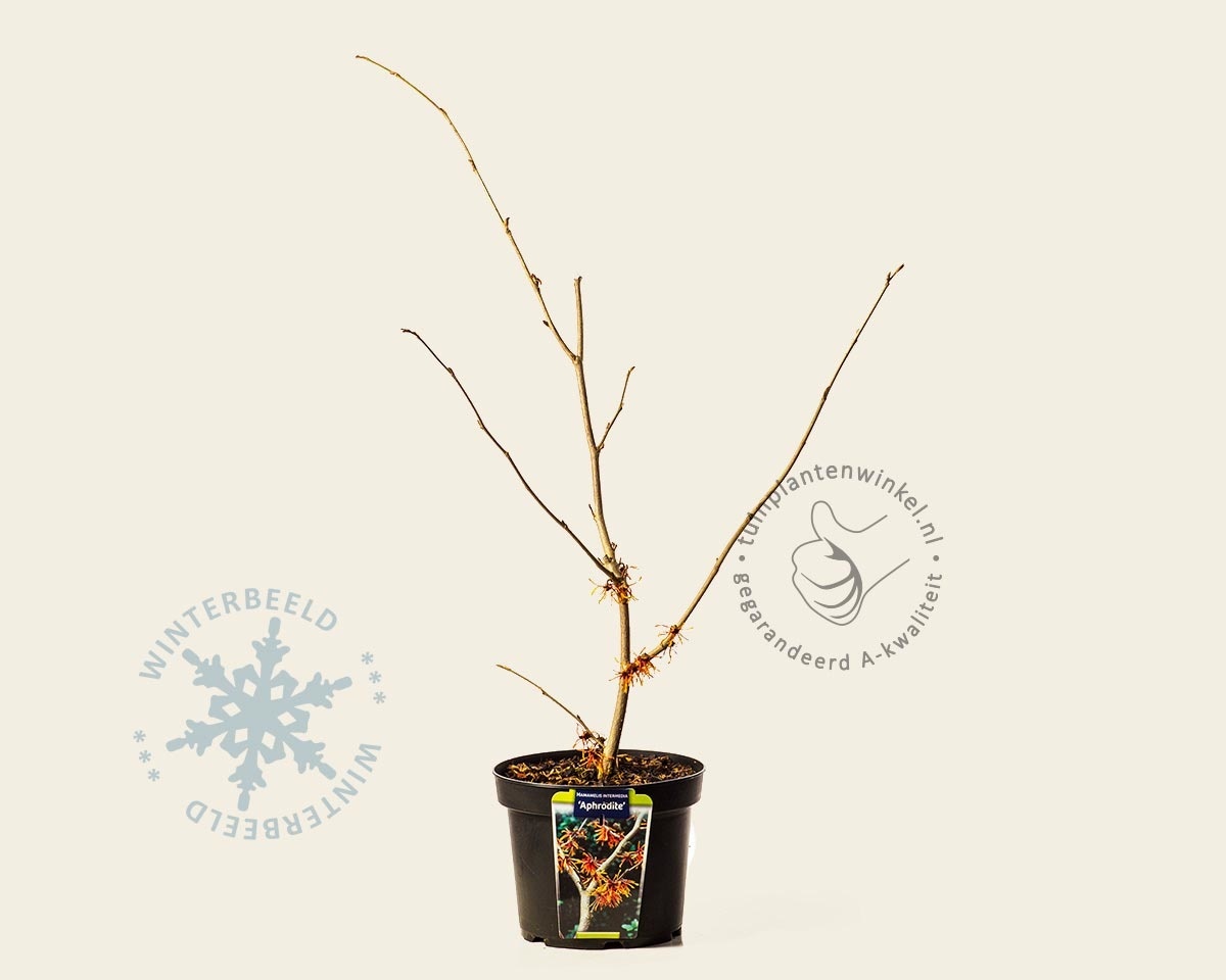 Hamamelis x intermedia 'Aphrodite' is een vroeg bloeiende, lichtgeurende tuinplant met warmoranje bloemen, die als solitair het best tot zijn recht komt. De bloei van de Toverhazelaar kan bij een zachte winter al in januari beginnen. Hamamelis x intermedia 'Aphrodite' bloeit op het kale hout met bloemen die lijken op een kluwentje wol. Deze tuinplant is goed bestand tegen vorst; de bloei stopt gewoon bij te lage temperaturen. De tuinplant groeit uit tot een vrij brede struik met een open structuur. In het najaar verkleuren de bladeren bruingeel of bronsgeel.