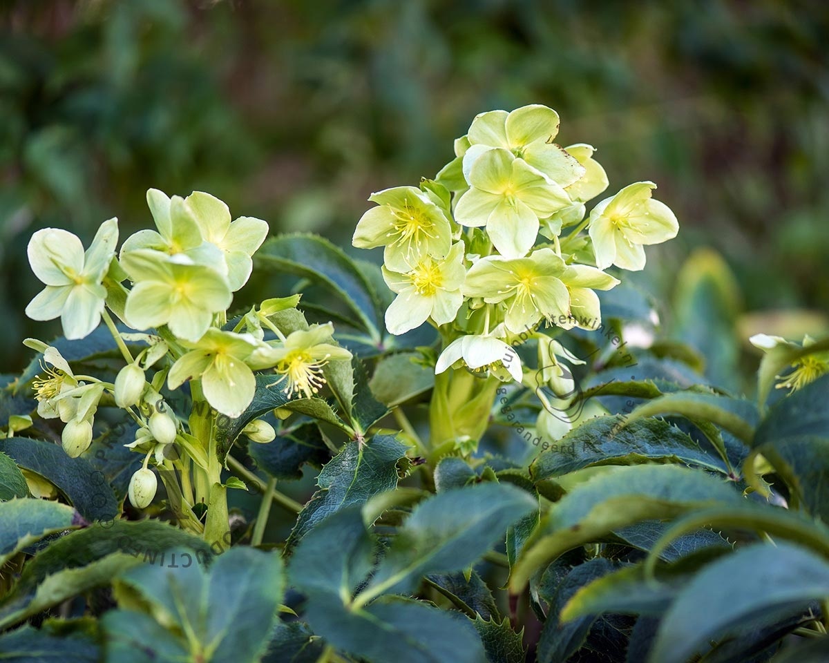 Antwoord: De Helleborus argutifolius heeft inderdaad knikkende bloemen met een groen witte kleur. De bloei is in de winter en staat graag op een beschutte plaats in de tuin.