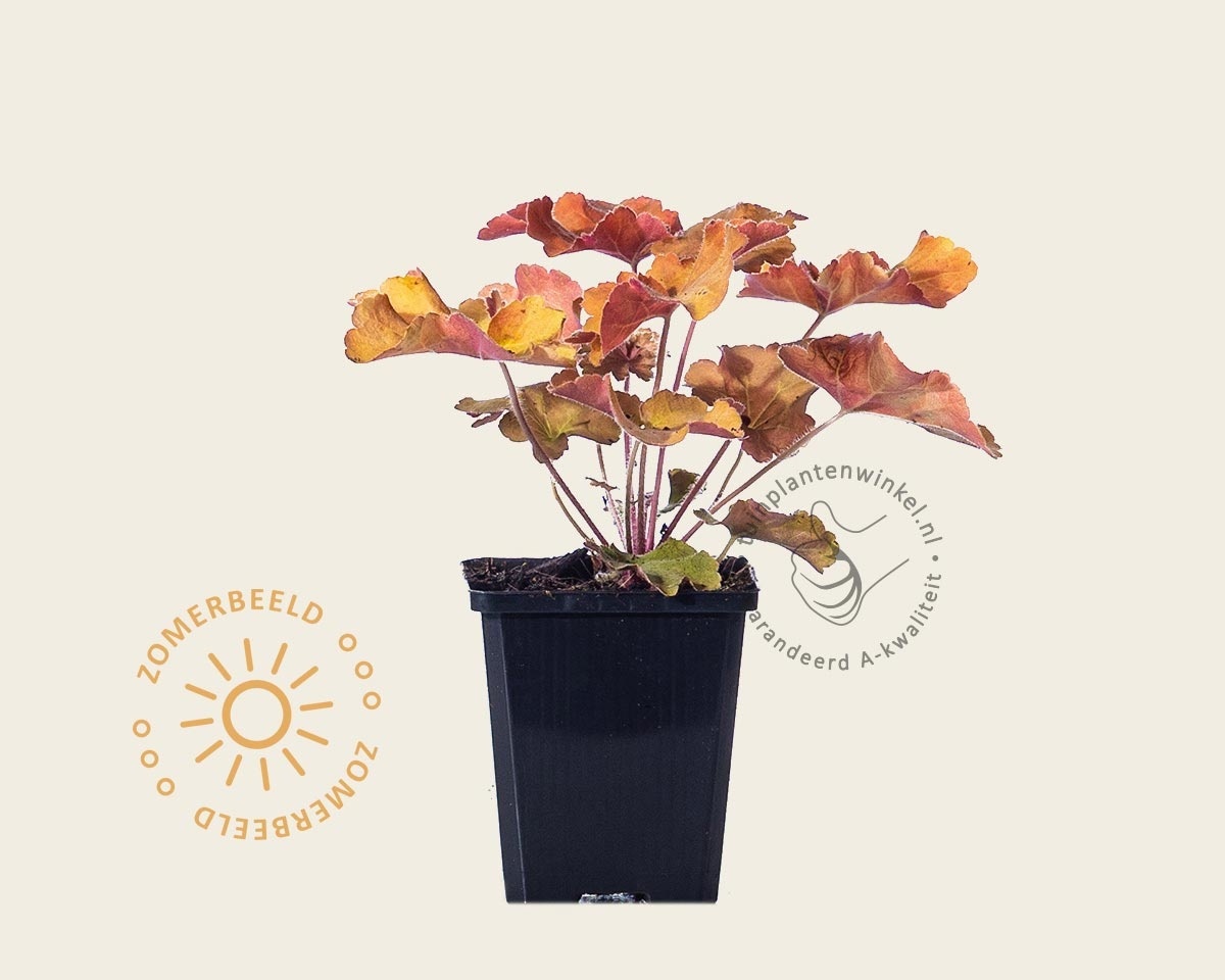 De bladeren van Heuchera 'Caramel' hebben een weinig voorkomende kleur: caramelbruin. Purperklokje bloeit in juni-juli met witroze bloemtjes aan vrij lange, dunne stengels, die een stuk boven de bladeren uitsteken. Deze tuinplant is een goede bodembedekker maar voldoet het ook uitstekend als pot- of kuipplant op het terras. Purperklokje is vorstbestendig en behoudt in de winter zijn bladeren.
