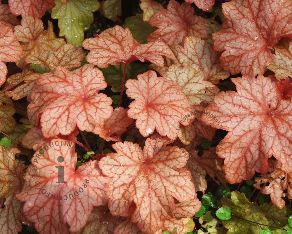 De Heuchera 'Carnival Watermelon' heeft melange van perzik / brons / rozerood gekleurde bladeren met duidelijk aanwezige aderen.