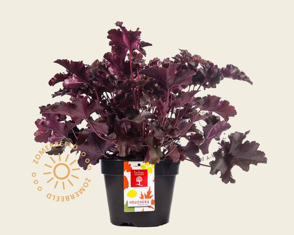 Heuchera 'Crimson Curls' is een compacte tuinplant; de bladkleur is opvallend met gekroesde randen waardoor de karmijnrode onderkant zichtbaar wordt. Heuchera komt oorspronkelijk uit Noord-Amerika en is vernoemd naar de Duitse botanicus Von Heucher.