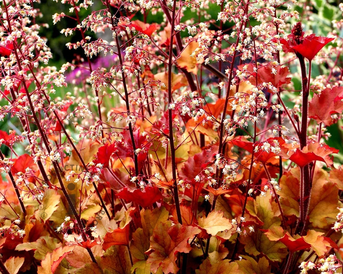 Heuchera 'Marmalade' is een mooie vaste tuinplant met opvallend oranjerood blad, dat kleur geeft in de border. Als de winter niet te streng is, behoudt de Heuchera zijn blad. Tijdens de bloeiperiode bloeit dit Purperklokje met crèmewitte bloemtrosjes op stelen die vanuit het midden van de plant komen. Het is een geschikte bodembedekker. Ook in een pot op het balkon of terras staat Heuchera 'Marmalade' decoratief.