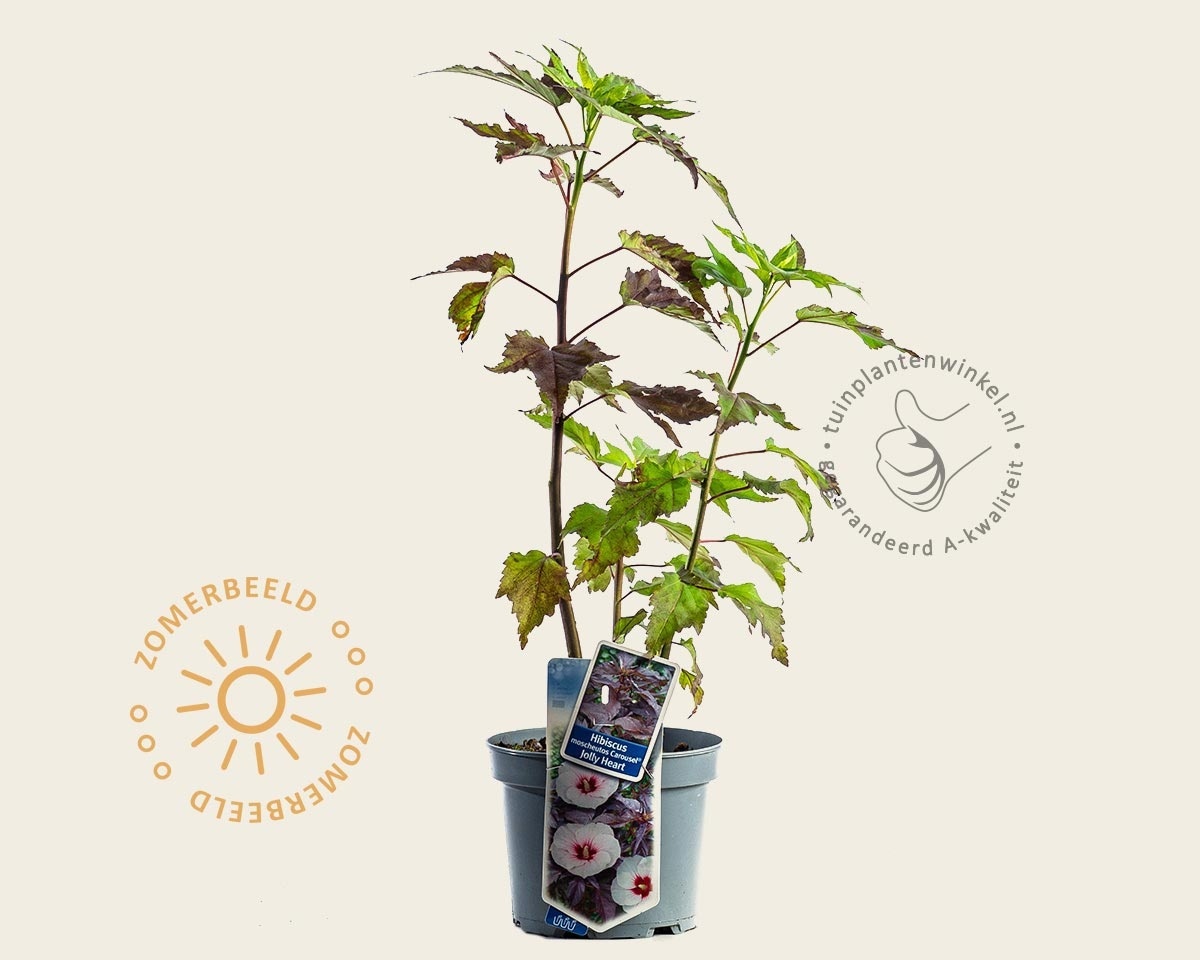 Hibiscus moscheutos 'Carousel Jolly Heart' bloeit in juli en augustus met grote, witte bloemen met een roze hart, die mooi afsteken tegen de roodgroene bladeren. Anders dan de Hibiscusstruiken, gedraagt deze soort zich als een vaste plant. Dat wil zeggen dat de stengels na de bloei in de zomer bovengronds afsterven en in het voorjaar weer vanuit de grond uitlopen. De Moerashibiscus is erg geschikt als solitair in de border maar kan evengoed in een kuip op het balkon of terras.