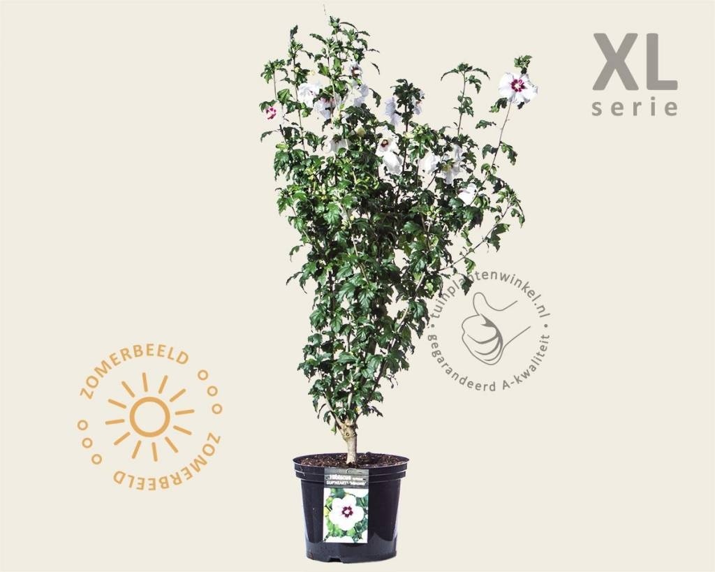 Hibiscus syriacus 'Sup Heart '- 'Minomb' - XL wordt als volwassen struik 1,5 tot 2 m hoog. De tuinplant vormt aan het eind van de zomer grote, witte bloemen met een rood hart. Na de bloei, die kan duren tot eind september, krijgt de Altheastruik kleine vruchten.