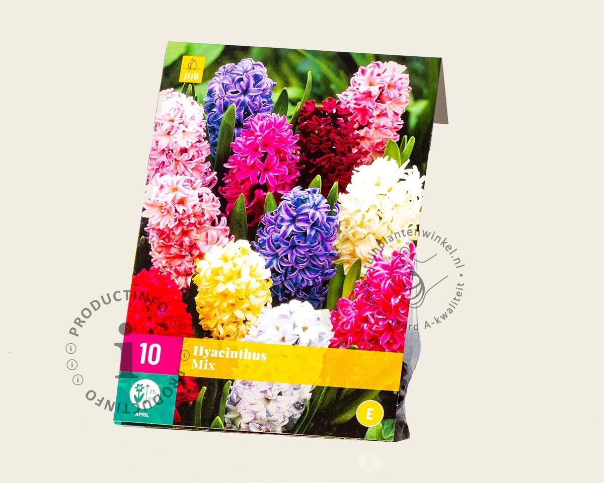 Prachtige Hyacinten in diverse heldere bloemkleuren, die goed tot uiting komen als ze in grotere groepen worden aangeplant. De Hyacint kenmerkt zich door de rozet aan de voet van de plant. Daaruit groeien langwerpige bladeren. De bloem bestaat uit een stengel met daaraan een veelvoud van kleine bloemetjes. Bij deze soort Hyacinthus Mix zijn ze fel en divers van kleur. Daarnaast geuren ze ook nog eens heerlijk.