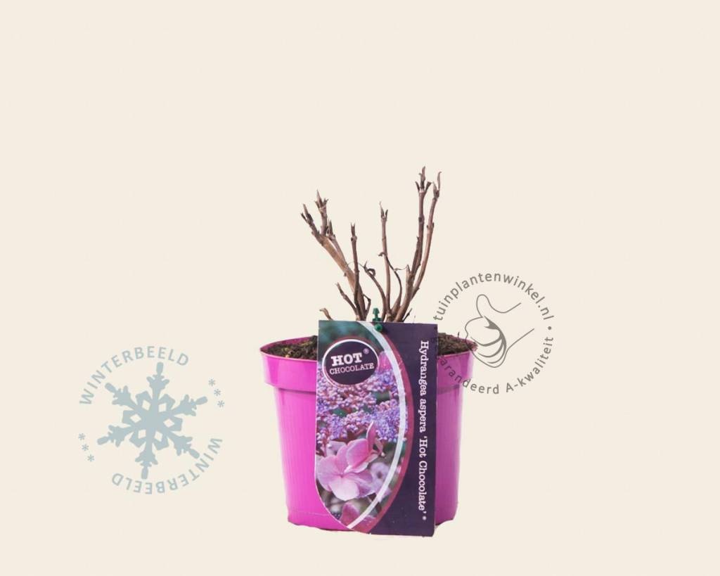 Hydrangea aspera 'Hot Chocolate' is een mooie solitair voor in de grotere border. Het is een forsere soort met zacht behaarde stengels en bladeren, die chocoladebruin of purperrood zijn. De Fluweelhortensia heeft een schermvormige bloeiwijze. De schermen worden gevormd door een witte bloemenkrans met daarbinnen een groot aantal roze-paarse bloemetjes.