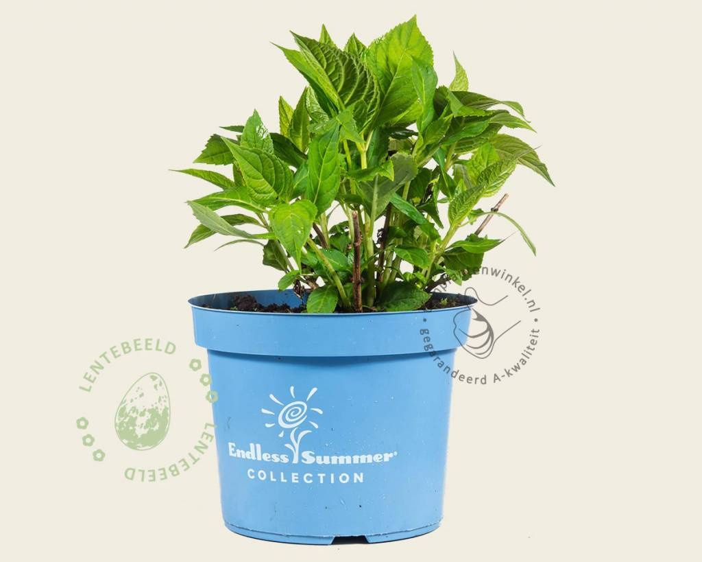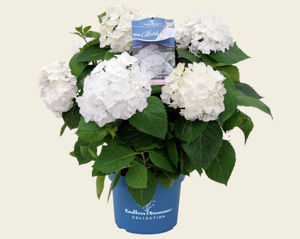 Hydrangea macrophylla 'Endless Summer The Bride' is een Amerikaanse cultivar en wordt onder licentie gekweekt. Hij heeft de mooie eigenschap, dat het een doorbloeiende hortensia is. Deze tuinplant maakt steeds nieuwe knoppen, waardoor hij een langere bloeitijd heeft dan gewone hortensia's. De bloemen verschijnen daarnaast ook op de nieuwe scheuten. Klassieke boerenhortensia's bloeien alleen op het tweejarig hout.