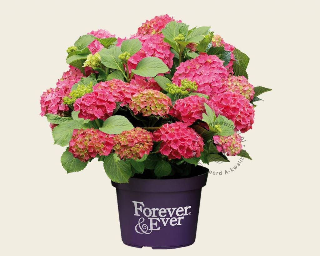 Hydrangea macrophylla 'Forever & Ever' is een Amerikaanse hortensia cultivar, die onder licentie wordt gekweekt. Deze hortensia moet dus wel speciaal zijn. En dat is de Hydrangea Forever & Ever ook. Deze hortensia heeft de mooie eigenschap dat het een doorbloeiende hortensia is. Hij maakt steeds nieuwe knoppen aan, waardoor hij een langere bloeitijd heeft dan gewone hortensia's. De bloei start vrij vroeg en duurt wel tot aan de eerste vorst. Deze variëteit geeft rode bloemen. Echt rood zijn ze eigenlijk niet, de kleur kan beter worden omgeschreven als dieproze/rood. Ook op nieuwe scheuten ontwikkelt deze hortensia bloemen. Hierdoor wordt het snoeien veel makkelijker.