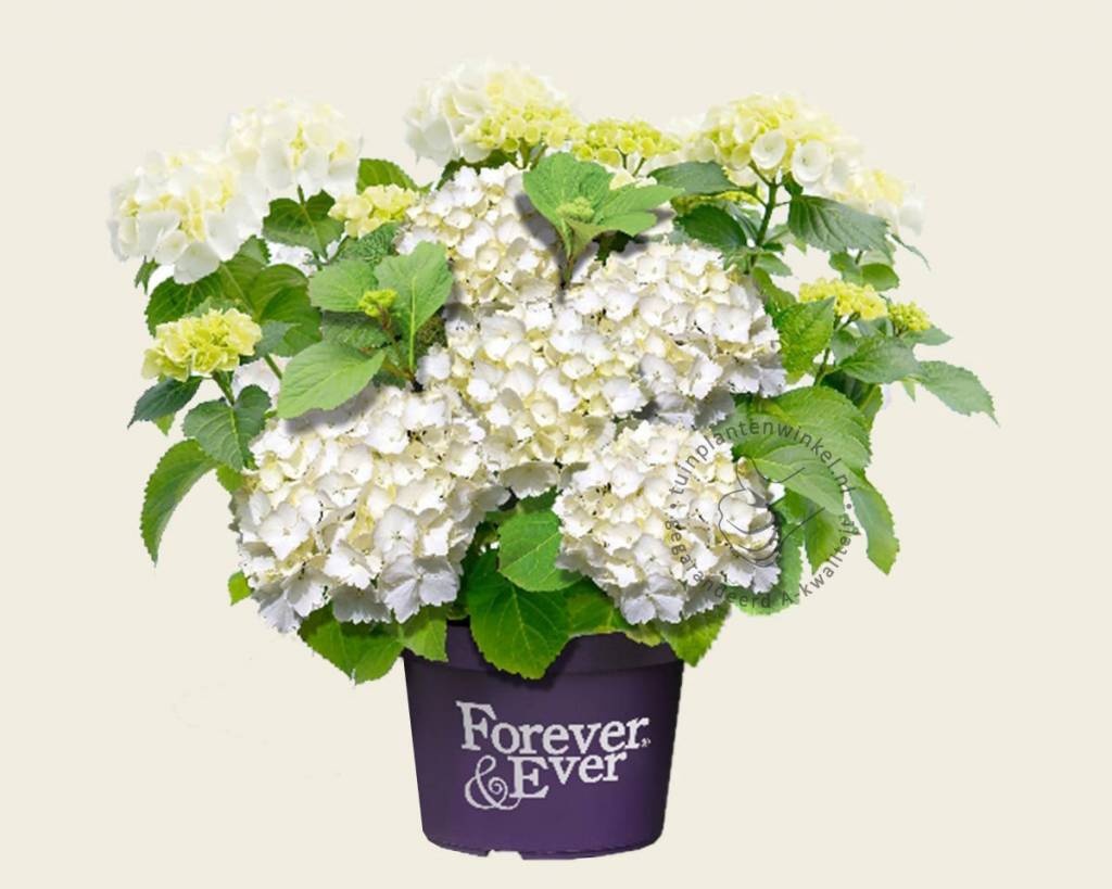 Hydrangea macrophylla 'Forever & Ever' is een Amerikaanse cultivar en wordt onder licentie gekweekt. Hij heeft de eigenschap dat het een doorbloeiende hortensia is, die steeds nieuwe knoppen aanmaakt, waardoor hij een lange bloeitijd heeft. De bloei van de tuinplant begint al in juni en gaat door tot de eerste vorstperiode. Hydrangea macrophylla 'Forever & Ever' bloeit zowel op één- als op meerjarig hout. Elke tak geeft witte bloemen, die een doorsnede van wel 20-25 cm hebben. De verzorging van deze tuinplant is niet moeilijk. Af en toe water geven is nodig, maar verder kan er weinig misgaan. Deze Hortensia is erg sterk, heeft geen last van vorstschade of een grote snoeibeurt. Wanneer een tak te lang wordt, knipt u die gewoon weg en u kunt zonder problemen bloemen afsnijden om in een vaas te zetten of te drogen.