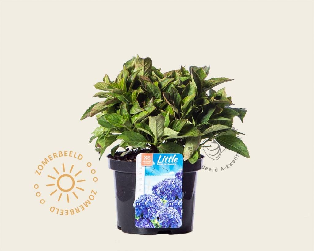 Hydrangea macrophylla 'Little Blue' heeft vlezige stengels en een groot(macrophylla) leerachtig blad. Hij behoort tot de Little-serie met laagblijvende, compacte groeiende hortensia's.