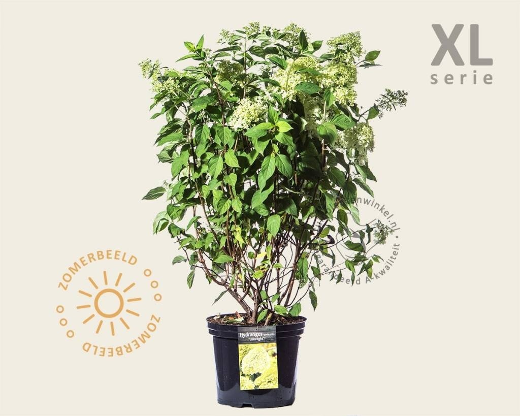 Hydrangea paniculata 'Limelight' heeft spectaculaire bloemen, die een frisse, geelgroene kleur hebben. De bloeiperiode van de Pluimhortentia is zeer lang van juni tot september. Deze hortensia heeft stevige takken, waardoor de tuinplant beter bestand is tegen felle regenbuien. De bloem begint in de knop wat limekleurig en als deze open gaat is ze lime-wit en richting het najaar kleuren de bloemen roze weg, waarna ze op den duur bruin worden.