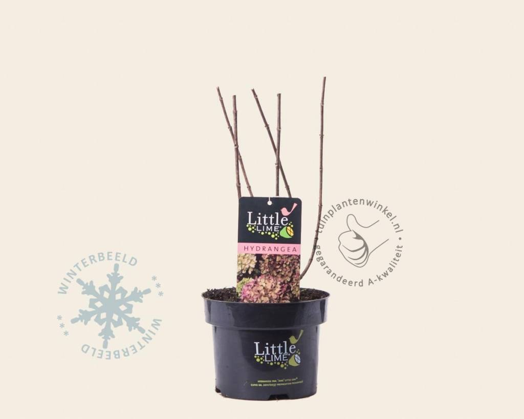 Hydrangea paniculata 'Little Lime' is een laagblijvende dwergvariant van de 'Limelight'. De tuinplant is een opgaande pluimhortensia met sterke twijgen. De eerste, iets toelopende, limoengroene tot crèmewitte bloemtuilen verschijnen eind juni/begin juli en verkleuren in de herfst naar een rozige tint. De uitgebloeide bloemen geven in de winter een mooi effect bij aanvriezende mist of lichte sneeuw. De tuinplant is bladverliezend en goed winterhard.