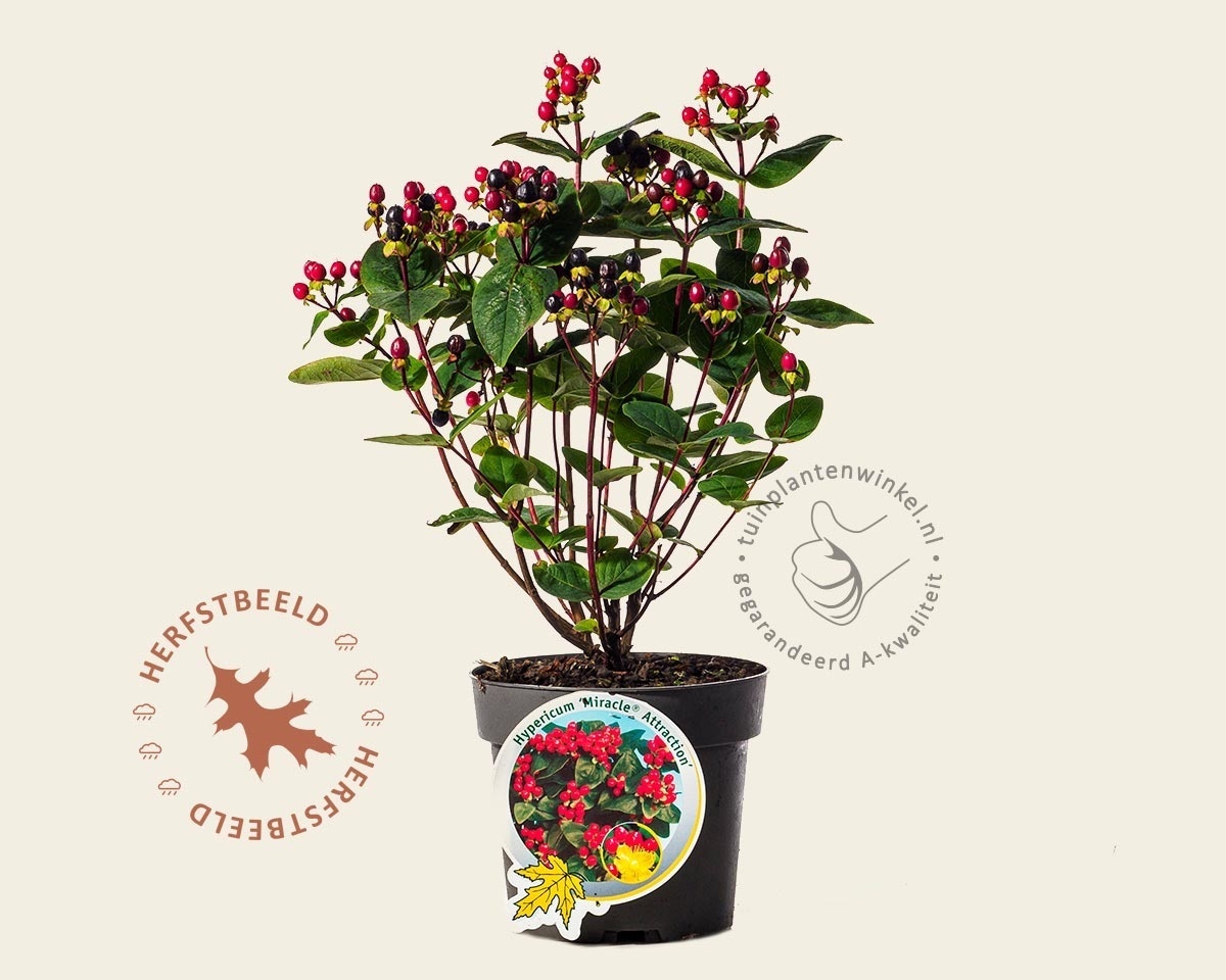 Deze Hertshooi uit de Miracle-serie is een compacte, vrij breed uitgroeiende struik met van juli - september gele bloemen, die later in het seizoen uitgroeien tot dieprode bessen, die door veel vogels worden gegeten. Hypericum 'Miracle Attraction' is geschikt als solitair of groepsbeplanting in de border. De tuinplant is vorstbestendig en verliest in de herfst zijn bladeren.