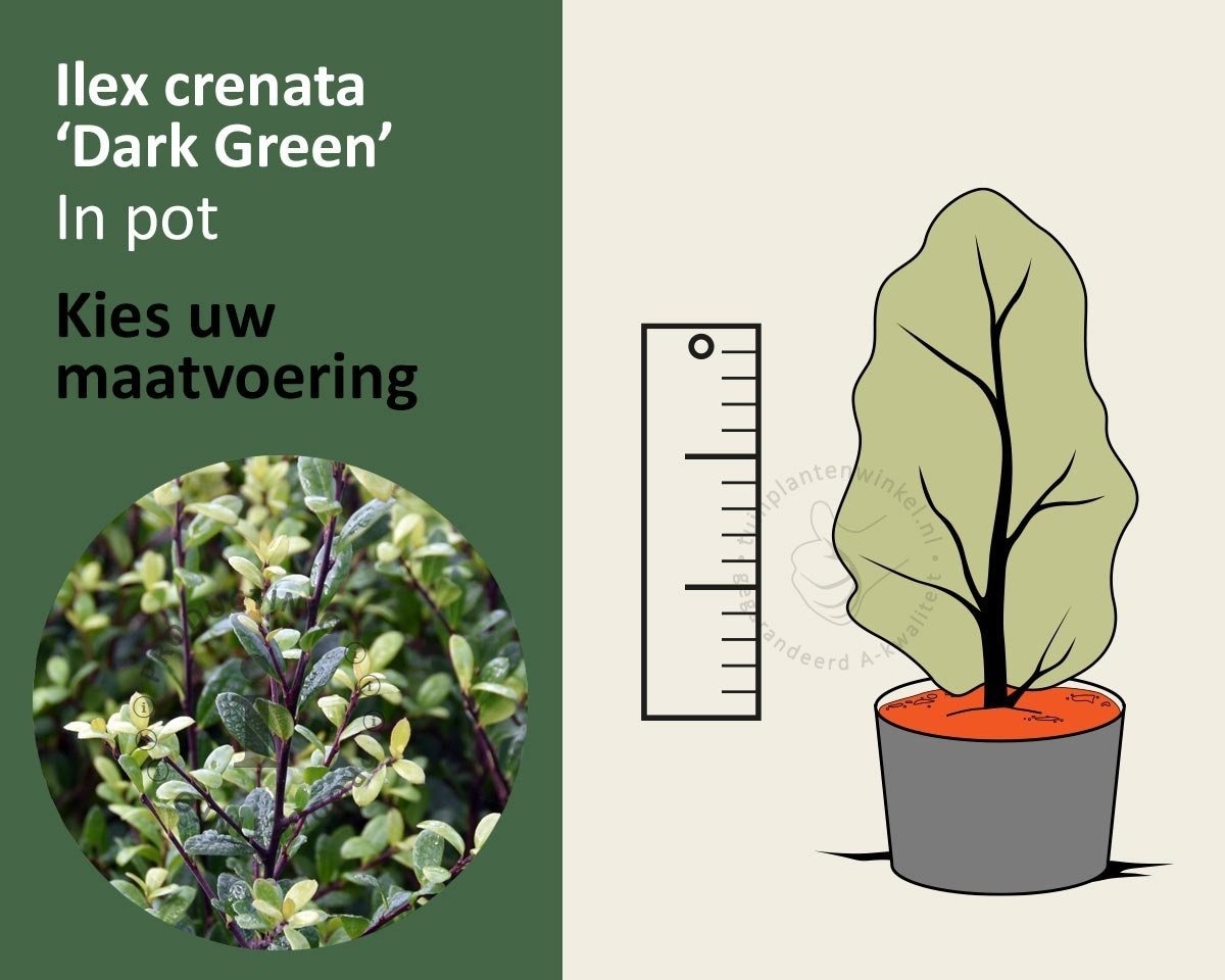 Zorgeloos uw Ilex crenata 'Dark Green' - in pot aanplanten, dat is natuurlijk wat u wilt! Bij Tuinplantenwinkel.nl verkopen we altijd A-kwaliteit planten en bomen van de allerbeste kwekers. Daarnaast geven we aangroei garantie op uw en alle andere tuinplanten die we online aanbieden.