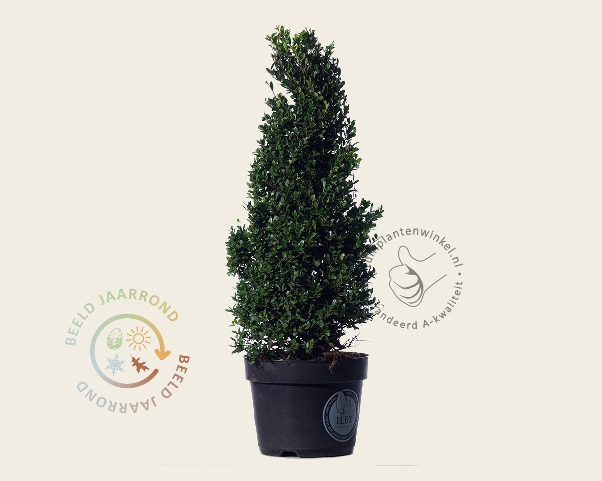 De Japanse hulst is een van de meest gekozen vervangers voor buxus, maar is eigenlijk veel meer dan dat. De plant is een sterke, wintergroene struik die zich goed laat snoeien in elke vorm. Deze kegelvorm komt goed tot zijn recht in zowel de tuin als in een pot. Het blad is ovaalrond en de 'Dark Green' heeft donkere, bijna zwarte twijgen. Bij jonge scheuten is het blad lichtgroen van kleur, maar deze verkleuren donkerder wanneer het blad ouder wordt. De plant lijkt wat betreft uiterlijk sterk op buxus, maar is niet gevoelig voor de buxusschimmel of rups van de buxusmot.