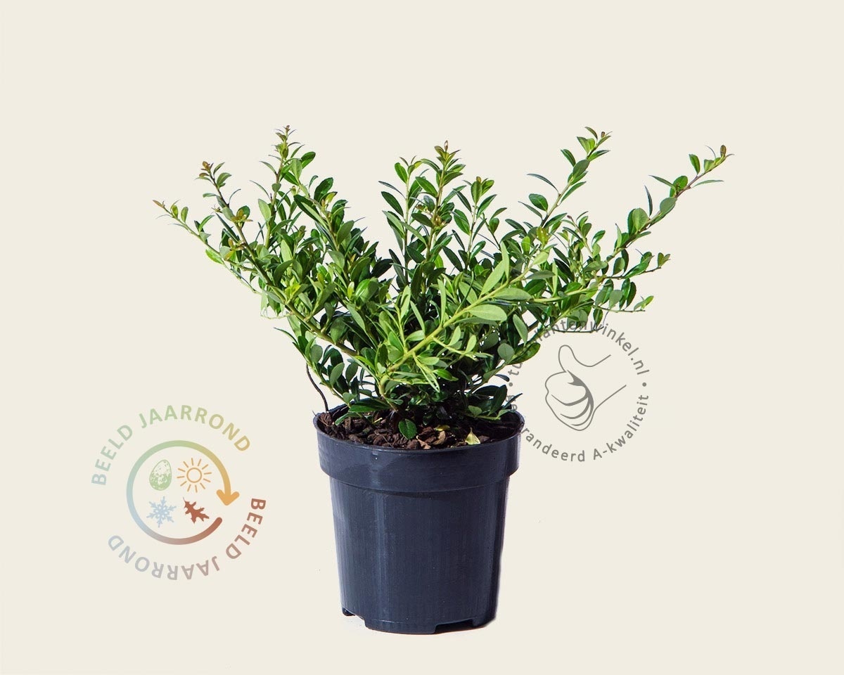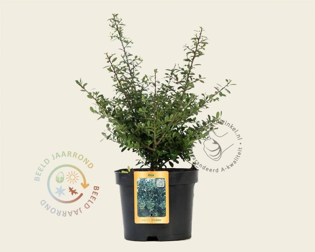 Antwoord: De Japanse hulst, Ilex crenata 'Stokes' geeft hele kleine witte bloemen, valt bijna niet op. Na de onopvallende bloei kunnen er kleine zwarte bessen zichtbaar worden. De kleine zwarte bessen worden goed gegeten door vogels. Ilex crenata 'Stokes' wordt veel als haagplant gebruikt rond om een border met bijvoorbeeld vaste planten en heesters. De Ilex crenata 'Stokes' is verkrijgbaar in de potmaat 9 cm en in potmaat 17 cm.
