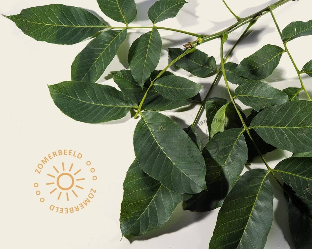 De Juglans regia is een gewone Notenboom of Walnoot. Een notenboom weert vliegen en andere insecten van uw terras. Let op; het kan enkele jaren duren voordat u noten kunt oogsten. Geef hem de tijd. In het voorjaar bloeit een volwassen boom met zwart-groene slierten die vrij snel afvallen. Bestuiving gebeurt door middel van pollen die zich met de wind mee laten voeren. In het najaar zijn de vruchten rijp waarna ze van de boom vallen. Een notenboom is goed winterhard.