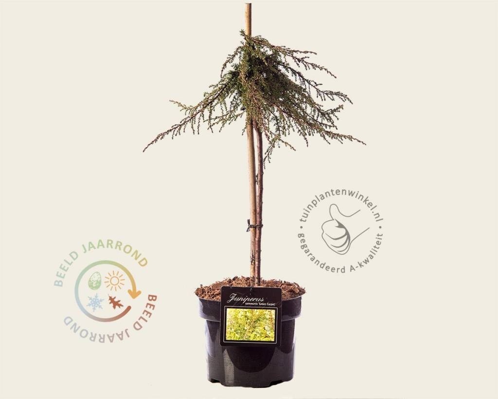 Juniperus communis 'Green Carpet' - 40 cm stam heeft dezelfde genetische eigenschappen als de oorspronkelijke tuinplant. De vorm van deze Jeneverbes verandert natuurlijk. De overhangende groeiwijze, wordt door de stam omhoog gebracht. De tuinplant groeit in 10 jaar uit tot een hoogte van ongeveer 100 cm. De Jeneverbes op stam is daarom heel geschikt voor de kleinere tuin of voor een sierpot op het balkon of terras. Het naaldvormige blad is het hele jaar groen. Het is een heel sterke plant.