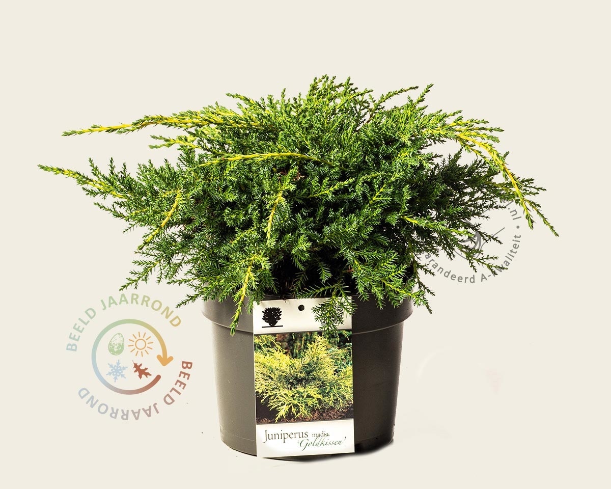 De Juniperus media 'Goldkissen' is een prachtige, groenblijvende struik die bekend staat om zijn gouden naalden en compacte groeivorm. Met zijn opvallende kleur en onderhoudsvriendelijke karakter is deze jeneverbes een ideale keuze voor tuinen van verschillende stijlen en groottes.