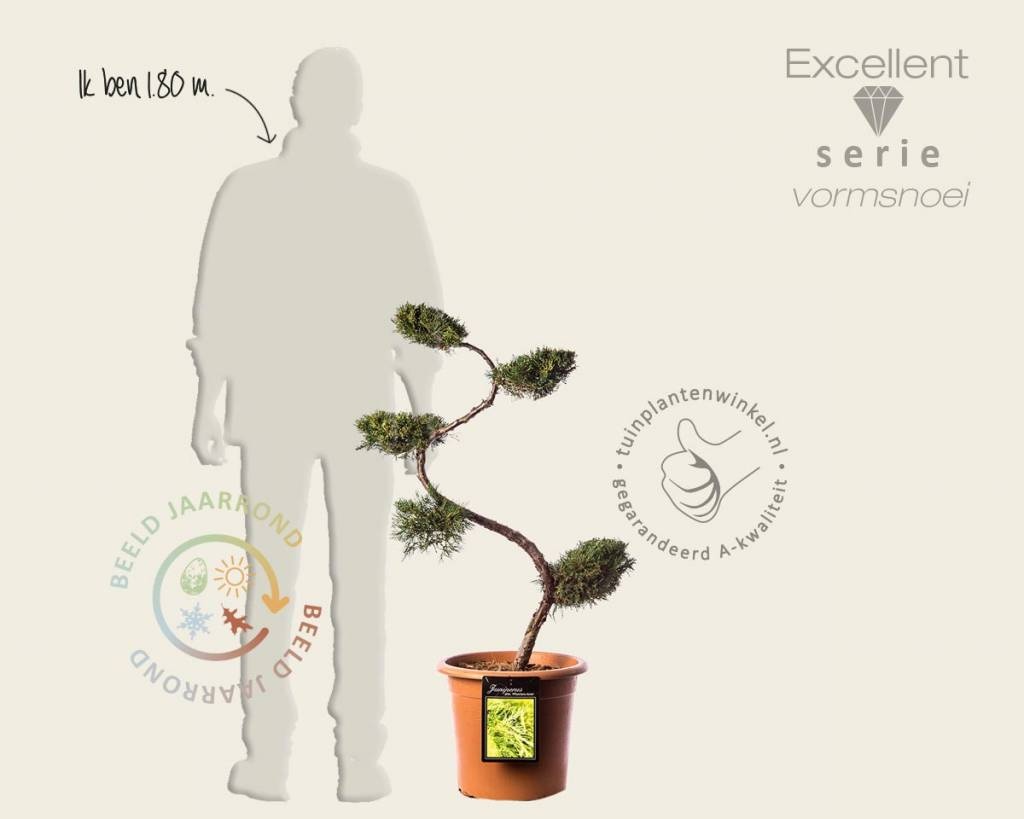 Juniperus media 'Pfitzeriana Aurea' - bonsai is een decoratieve kweekvorm, die door een bepaalde techniek de bonsai-vorm heeft gekregen. Genetisch gezien is de tuinplant identiek aan de natuurlijke plant. De hoogte van de Jeneverbes bonsai is 80-90 cm en daarom heel geschikt voor de kleine ruimte. De bonsai kan in een sierpot geplant worden, maar zeker ook in de volle grond. De tuinplant is groenblijvend. Het blad heeft een geelgroene kleur.