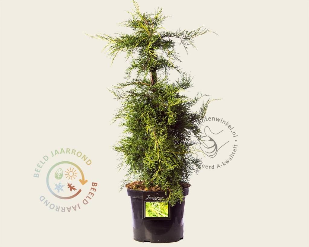Juniperus media 'Pfitzeriana Aurea' wordt 120 cm hoog en is daarom heel geschikt voor de kleine ruimte. In de border van de rots(tuin) als solitair of met een paar bij elkaar, in een sierpot op het terras of balkon, zorgt deze Jeneverbes het hele jaar voor een groen accent. Het naaldvormig blad heeft een geelgroene kleur.