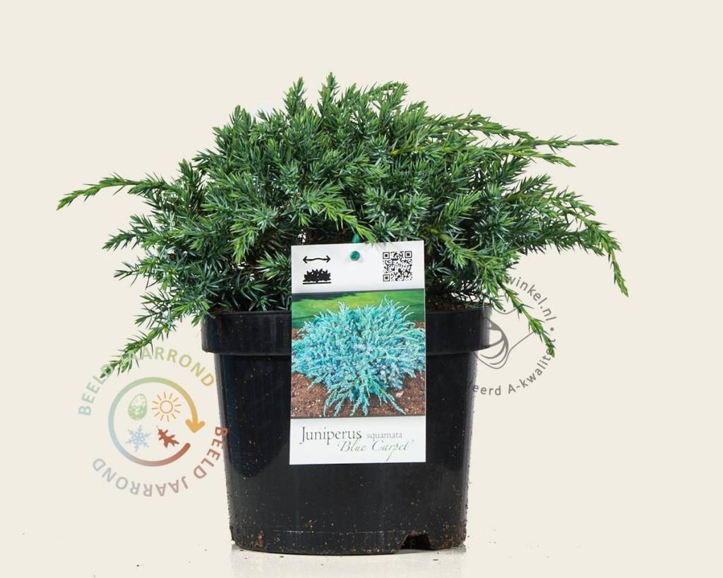 Juniperus squamata 'Bl;ue Carpet' is een groenblijvende dwergconifeer en heeft een brede groeiwijze, waardoor hij goed als bodembedekker kan dienen. Verder is de Jeneverbes solitair of in een groep geschikt als accentplant voor elke border. Ook in het openbaar groen (bv. rotonde) is deze gemakkelijke tuinplant aan te raden. De naalden zijn blauwgrijs en verkleuren in de winter paarsblauw. Er vormen zich geen bloemen of bessen bij deze soort.