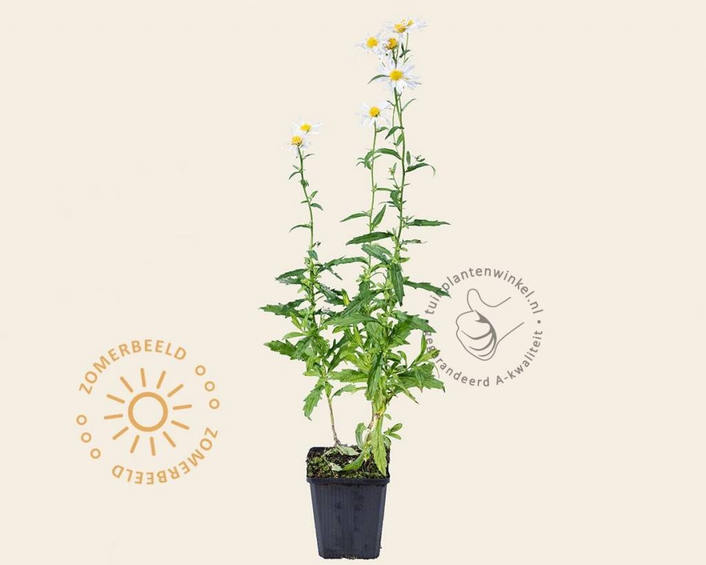 Kalimeris incisa 'Alba' bloeit de hele zomer lang met fijne, witte straalbloemetjes en een geel hartje, die allerlei insecten aantrekken. De Zomeraster komt oorspronkelijk uit Oost-Azië en groeit wat wilder dan de bekende aster. De tuinplant is winterhard, bladverliezend en voldoet het beste door er een aantal bij elkaar te zetten iets meer achter in de border.
