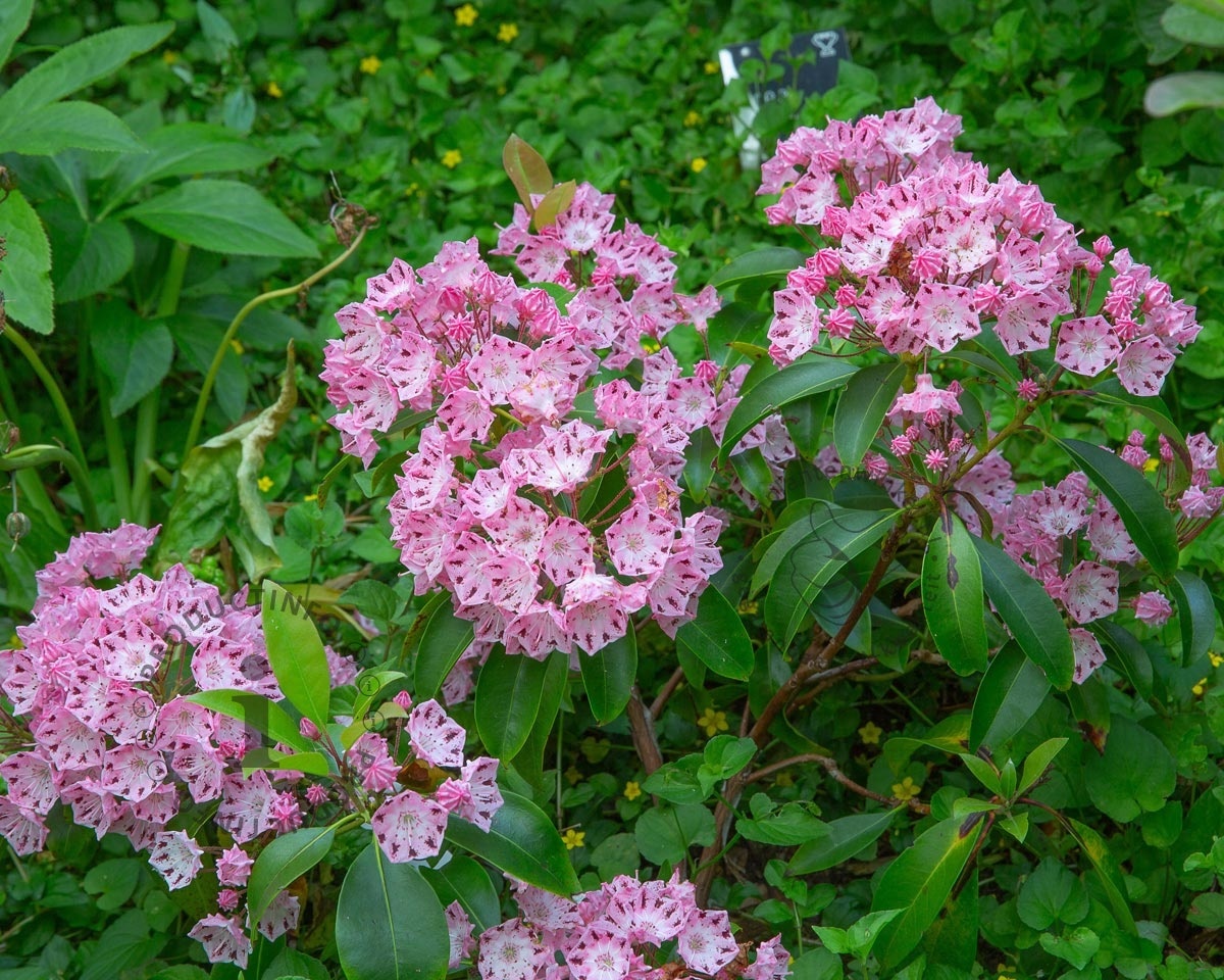 Kalmia latifolia 'Mayland' bloeit in het voorjaar met bekervormige, roze bloemen met donkere accenten. De Lepelboom heeft veel van dezelfde eigenschappen als de Rododendron en de Azalea en kan daarom in de border uitstekend hiermee worden gecombineerd. De tuinplant behoudt in de winter zijn bladeren en is goed vorstbestendig.