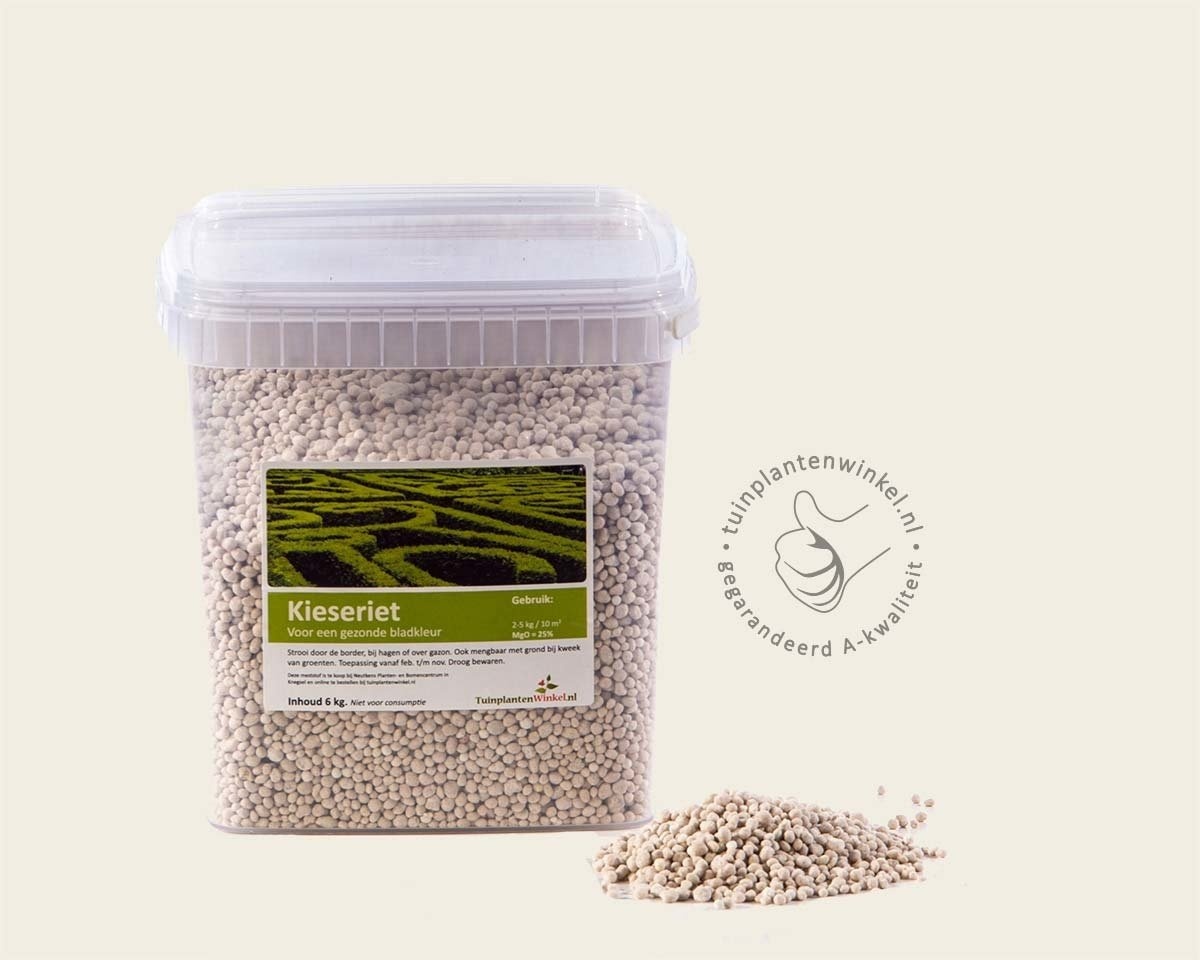Kieseriet bevat een hoog gehalte aan Magnesium. Dit zorgt voor een extra groene bladkleur van uw planten en het gazon. Vooral bij wintergroene hagen en heesters wordt kieseriet veelvuldig toegepast. Strooi de kieseriet rondom de planten uit. Kieseriet wordt snel opgenomen door de plant.