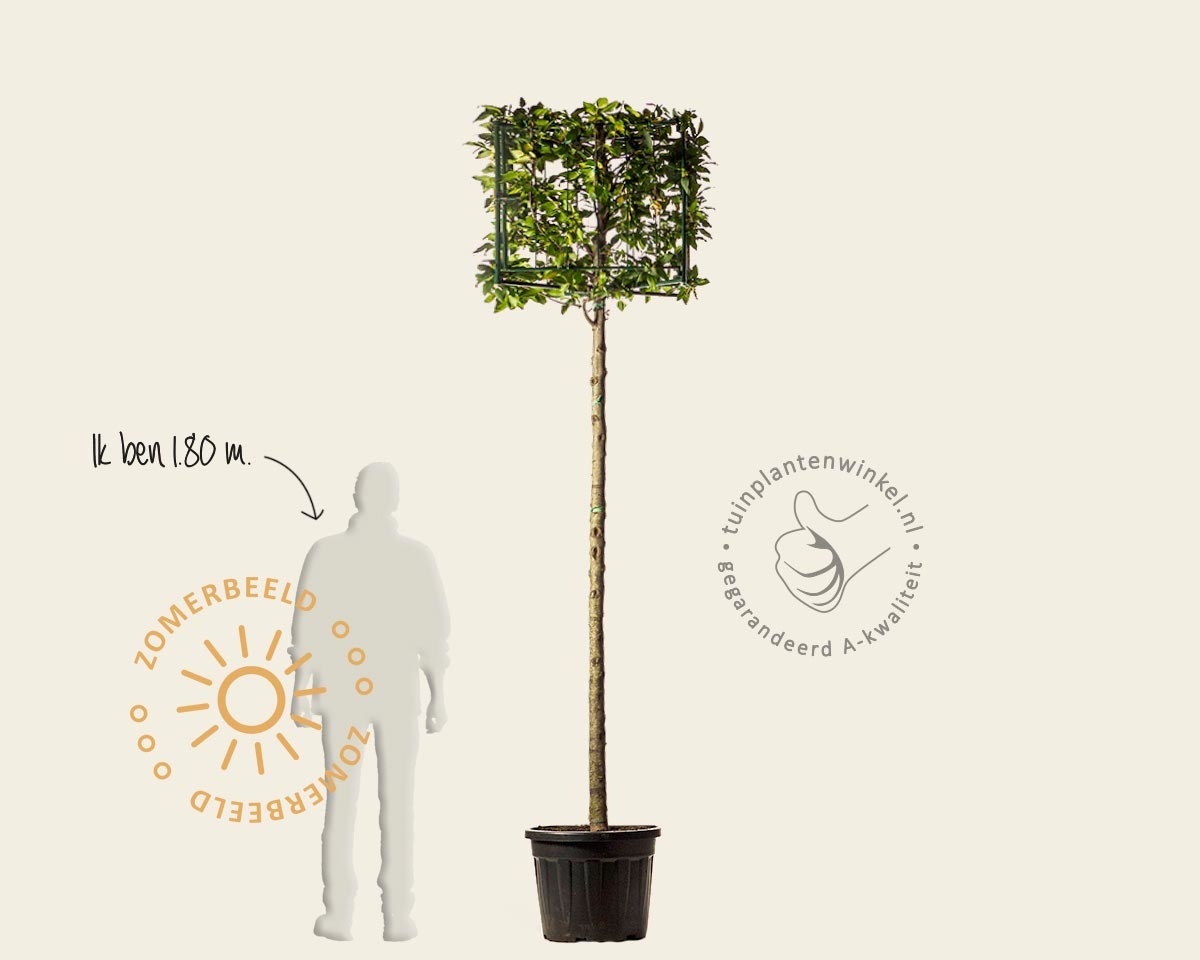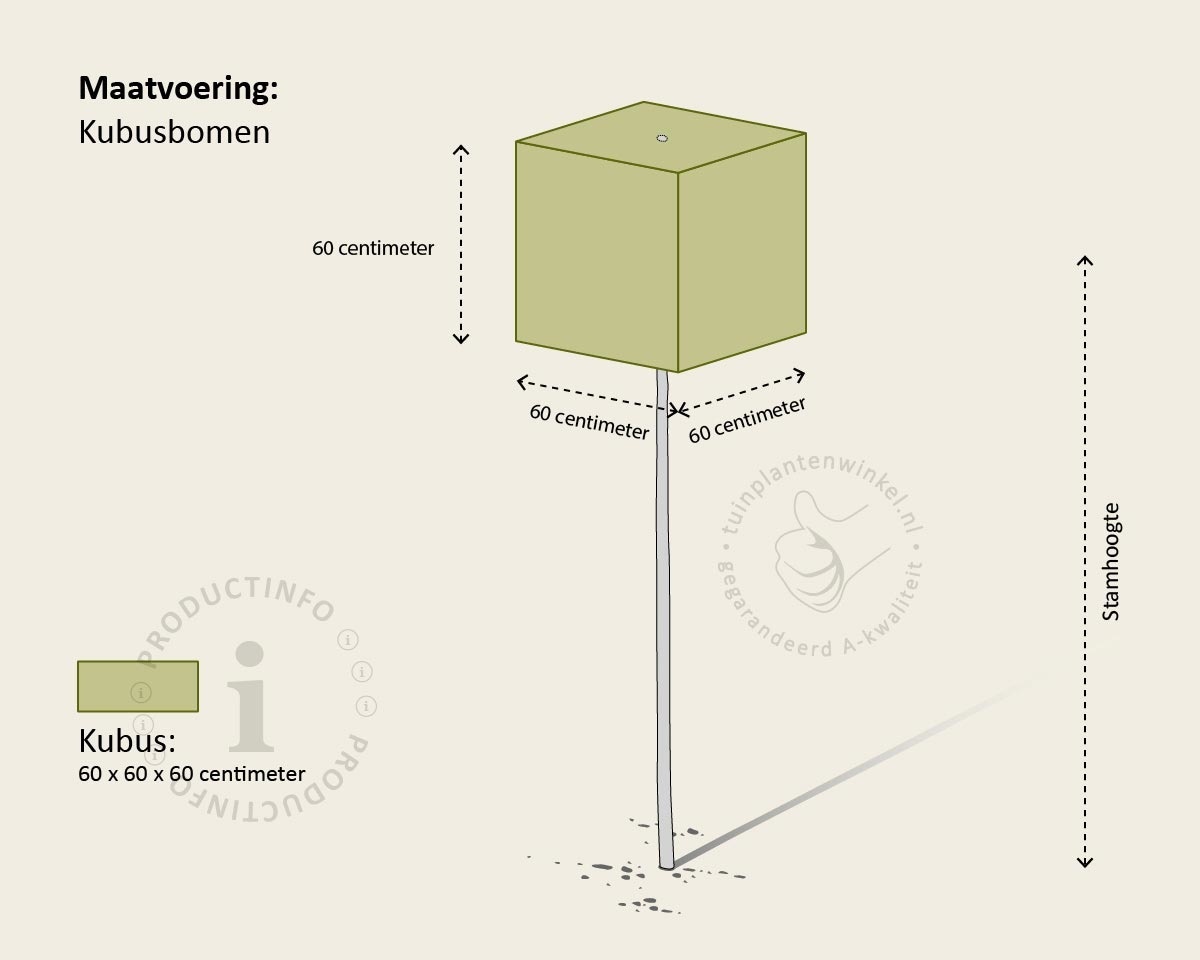 Met deze kubus- of blok-vormige boom plaatst u een echte eye-catcher in de tuin. Het snoeien van bomen is een eeuwenoud recept en werd op grote schaal toegepast in vooral de Franse tuincultuur. Door de laanbomen te snoeien in strakke vormen gaf men de lanen nog meer allure. Ook zorgt het snoeien voor strakke lijnen in de tuin omdat alle bomen er nagenoeg hetzelfde uitzien.