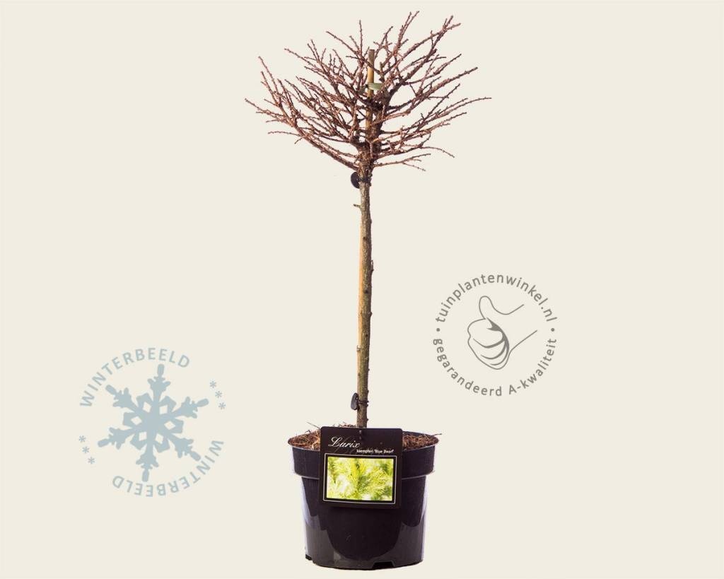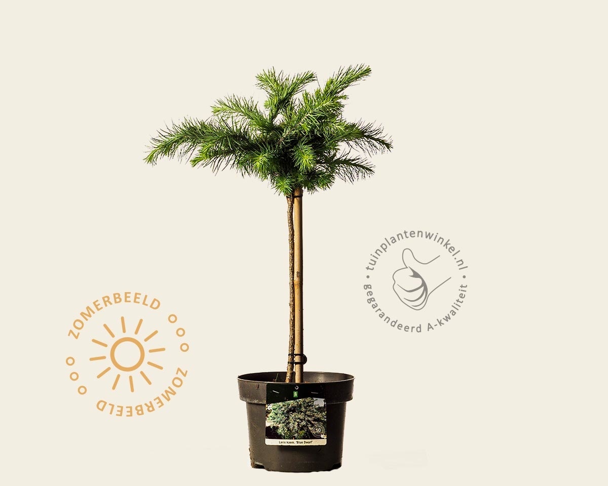Larix kaempferi 'Blue Dwarf' - 40 cm stam is een geënt boompje. De vorm van de Japanse lork verandert daardoor, maar de eigenschappen van de oorspronkelijke tuinplant blijven hetzelfde.