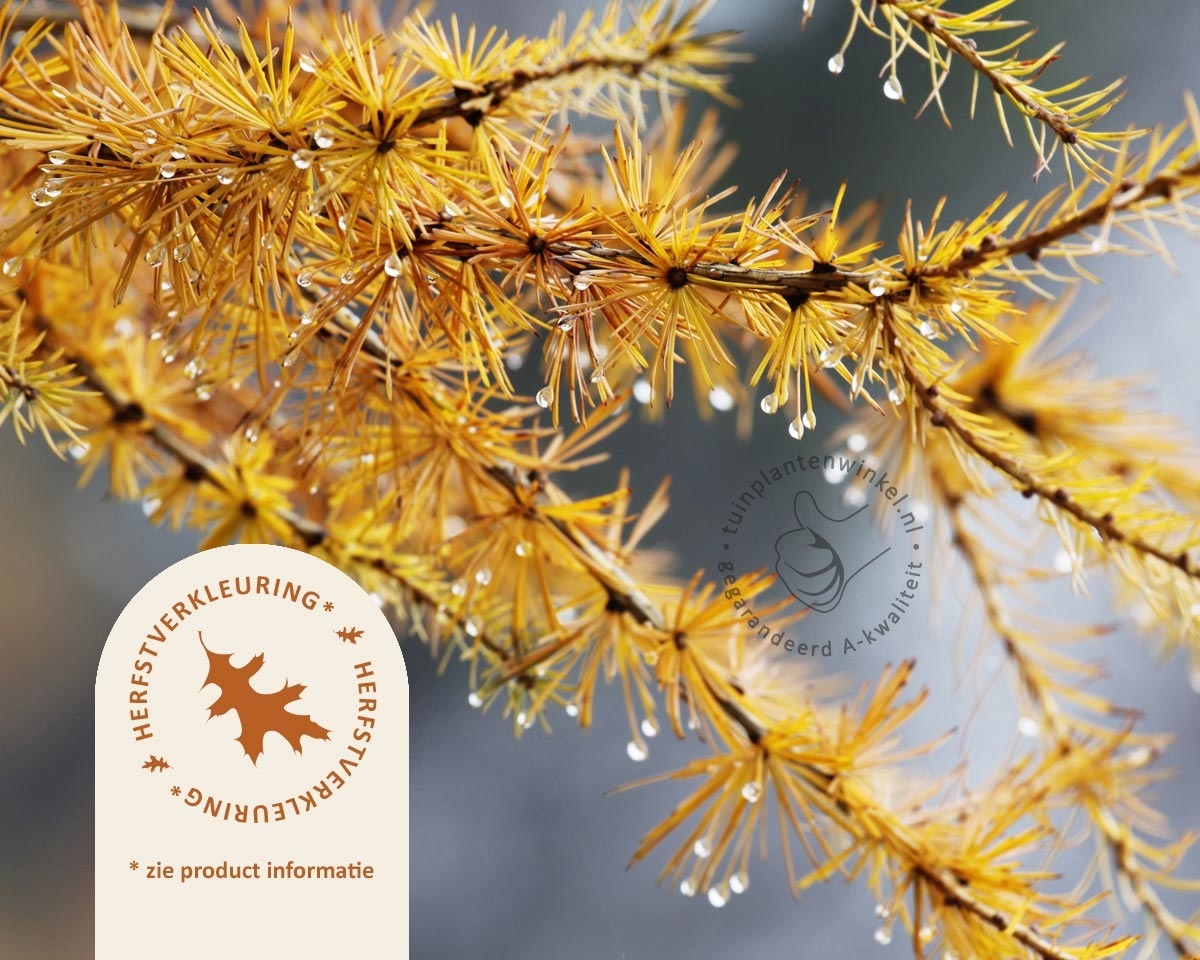 Het blad van Larix kaempferi 'Blue Dwarf' verkleurt in het najaar. De kleuren op de foto geven een indicatie van deze verkleuring. De exacte verkleuring is afhankelijk van de standplaats en het weer en kan per jaar verschillen. Het is dus niet zeker of u de verkleuring zoals deze gefotografeerd is, ook terugziet in uw tuin. Aan de kleuren die op deze foto zichtbaar zijn, kunnen geen rechten worden ontleend.