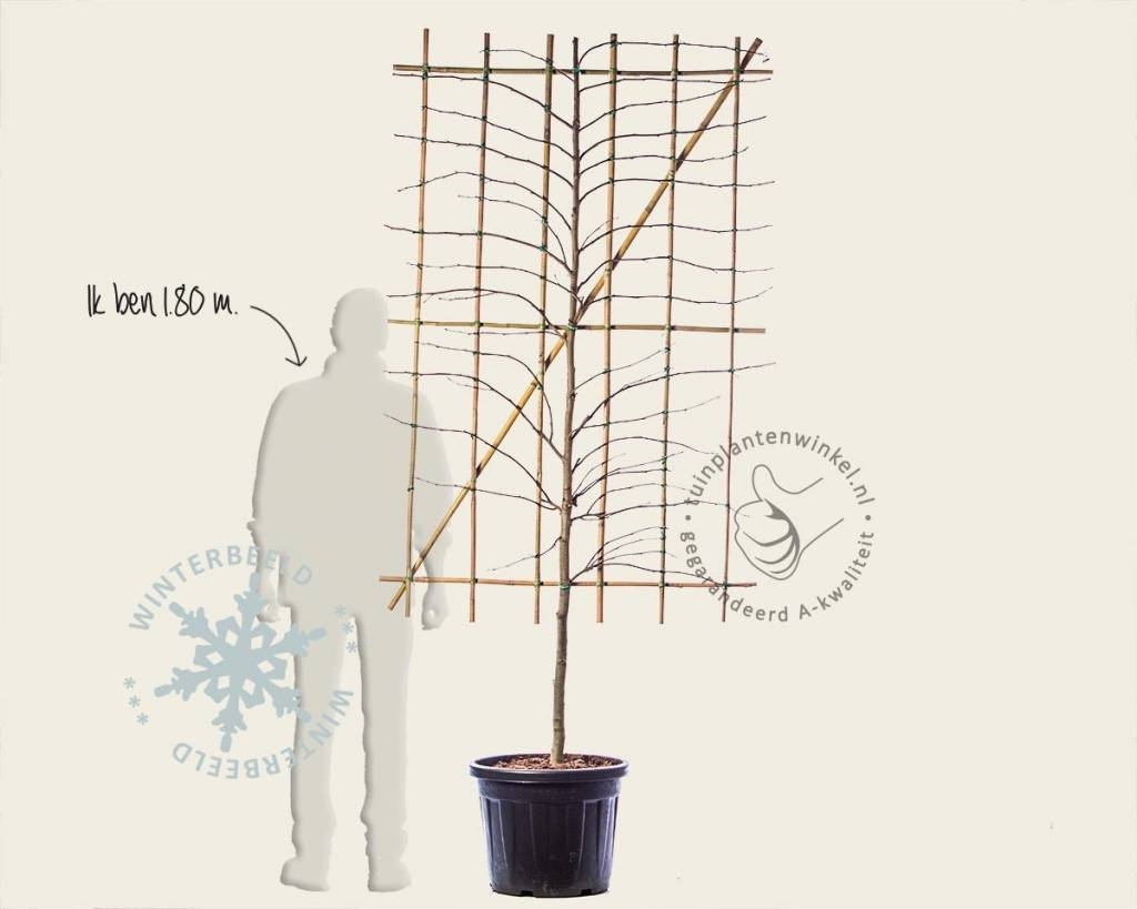 Deze Lei-scherm uitvoering kan worden gebruikt om kamers in uw tuin te creëeren, een muur of schutting te camoufleren of juist om het zicht af te blokken vanaf de straatzijde. De boom heeft een korte stam van 50 centimeter met daarboven een scherm van 120 x 180 centimeter. Het frame kan worden vergroot door parallel extra bamboestokken aan te binden. U kunt de kluit van de boom tegen de schutting aan plaatsen maar bij voorkeur plaatst u de stam op een afstand van minimaal 40 à 50 centimeter of meer.