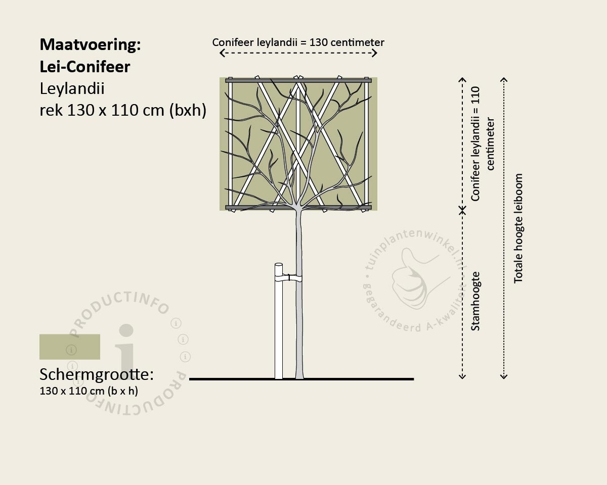 Ons advies is om de rekken van de Lei-Conifeer 'Leylandii' maximaal 60 centimeter uit elkaar te plaatsen. Door de rekken van de leibomen aan elkaar te koppelen ontstaat een sterk geheel en kunt u de takken van de leibomen naar elkaar toe laten groeien.