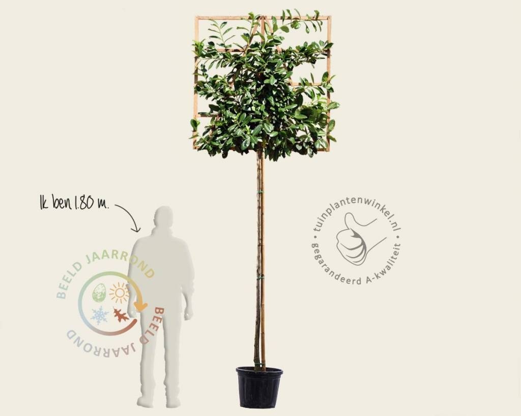 De Lei-Laurier is een groenblijvende leiboom met grote, leerachtige bladeren. Bij Tuinplantenwinkel.nl vindt u deze leiboom in verschillende afmetingen (Basic-, Classic-, Small-, Scherm- en 120-serie). Deze leivorm in de 120-serie heeft een schermgrootte van 120 x 120 centimeter en is aangebonden in een houten lattenframe. De takken zijn uitgewaaierd over het scherm zodat er snel een dicht scherm ontstaat. Bijna alle takken van de boom worden hierbij aangebonden.