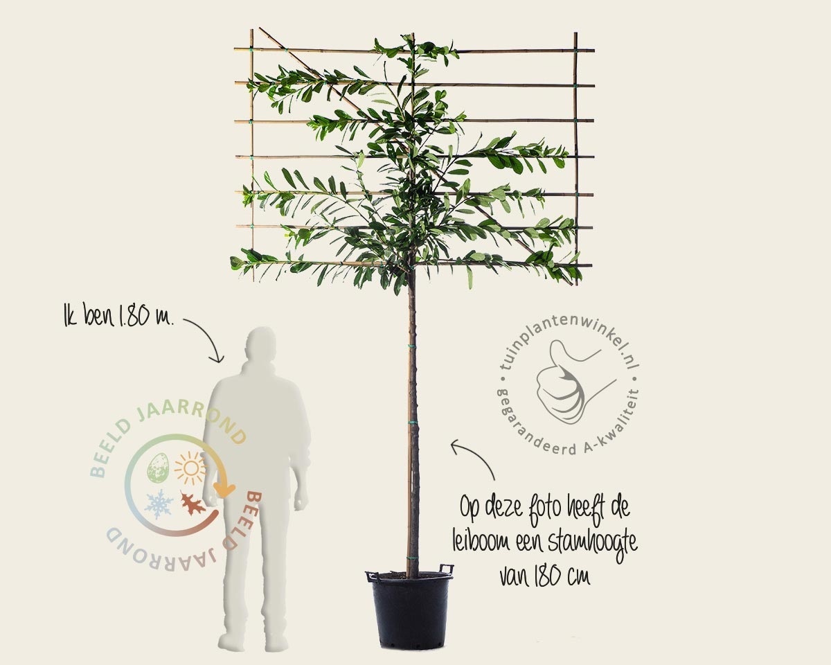 Lei-Prunus laurocerasus 'Novita' is een groenblijvende leiboom. De boom heeft mooi glanzend en langwerpig blad dat iets breder is dan bij de soortgenoot 'Caucasica'. De Lei-Laurier bloeit in het voorjaar met staande witte, kaarsvormige bloemtrossen, vaak gevolgd door zwarte bessen. Na de winter of in het najaar kan er wat bladval plaatsvinden (rui). Dit is heel normaal; de Lei-Laurier krijgt al snel daarna weer vele, nieuwe, mooi heldergroene bladeren. Een wintergroen alternatief voor de Lei-Laurier zou de lei-vorm van de Photinia fraseri 'Red Robin' (of Glansmispel) kunnen zijn.