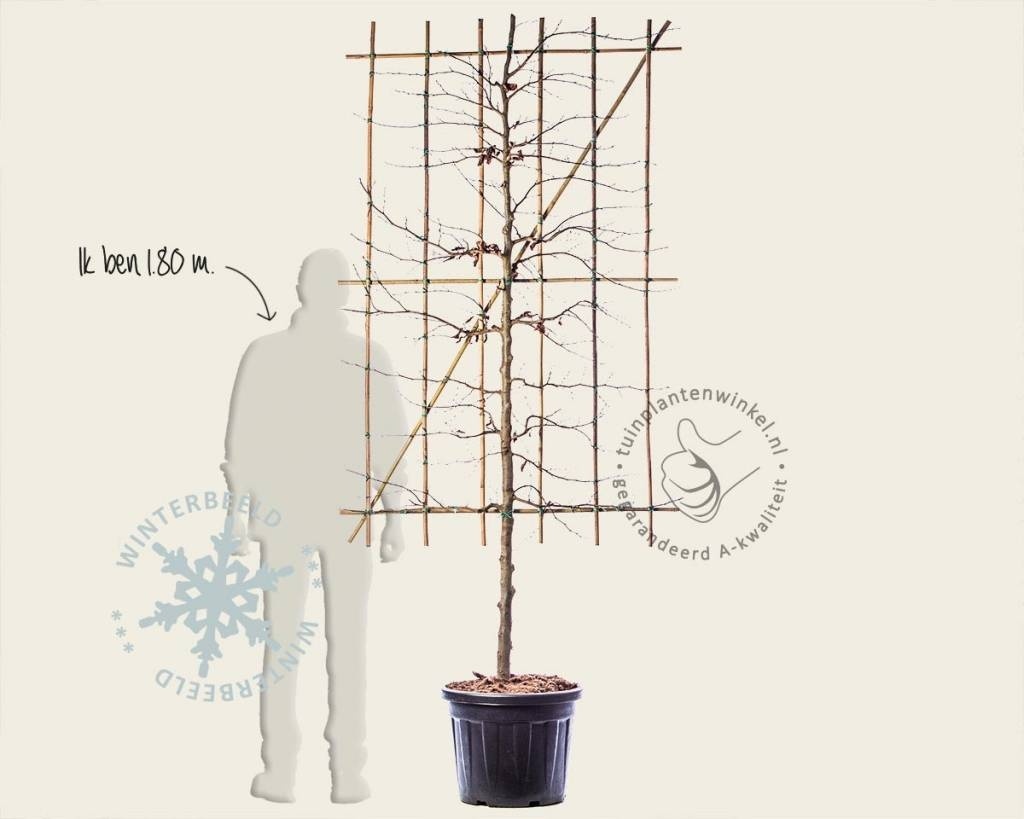 Deze Lei-scherm uitvoering kan worden gebruikt om kamers in uw tuin te creëeren, een muur of schutting te camoufleren of juist om het zicht af te blokken vanaf de straatzijde. De boom heeft een korte stam van 50 centimeter met daarboven een scherm van 120 x 180 centimeter. Het frame kan worden vergroot door parallel extra bamboestokken aan te binden. U kunt de kluit van de boom tegen de schutting aan plaatsen maar bij voorkeur plaatst u de stam op een afstand van minimaal 40 à 50 centimeter of meer.