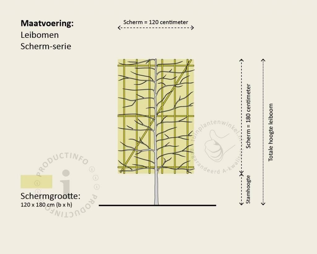 Deze Lei-scherm uitvoering kan worden gebruikt om kamers in uw tuin te creëeren, een muur of schutting te camoufleren of juist om het zicht af te blokken vanaf de straatzijde. De boom heeft een korte stam van 50 centimeter met daarboven een scherm van 120 x 180 centimeter. Het frame kan worden vergroot door parallel extra bamboestokken aan te binden. U kunt de kluit van de boom tegen de schutting aan plaatsen maar bij voorkeur plaatst u de stam op een afstand van minimaal 40 à 50 centimeter of meer.