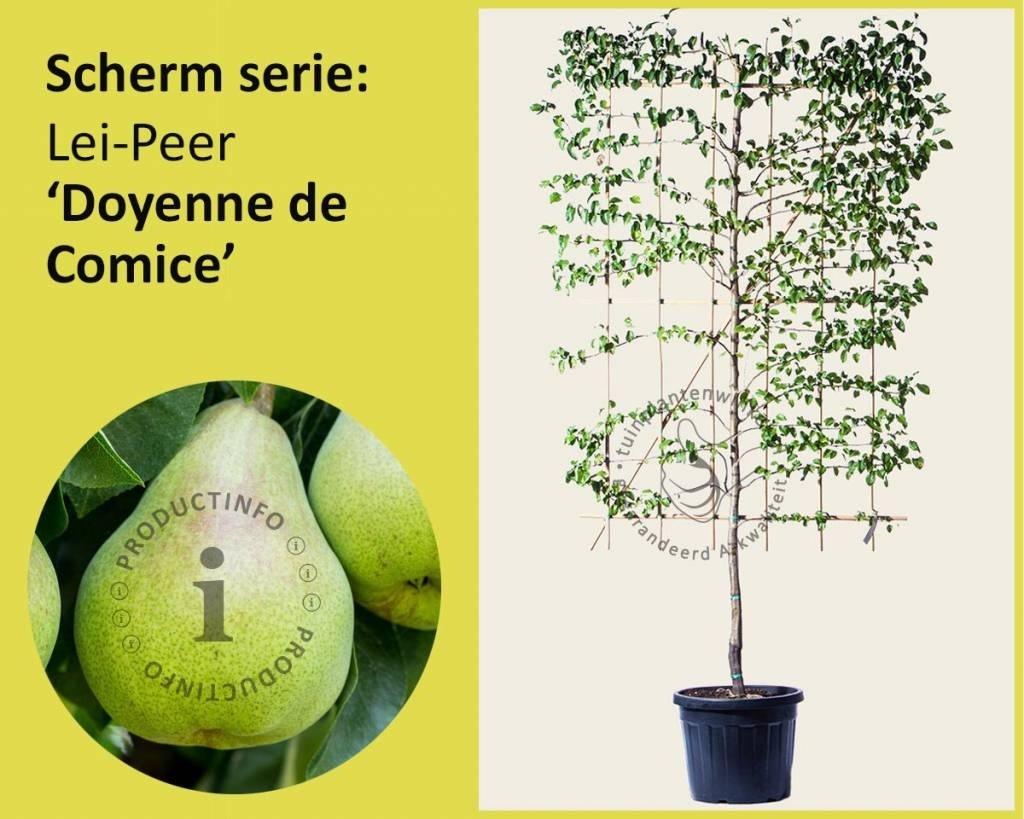 Lei-Pyrus communis 'Doyenne du Comice' is een karakteristieke fruitboom met glanzend, diepgroen blad in de zomer. In het voorjaar bloeit deze perenboom met witte bloesem. Als de bestuiving goed is geweest, zullen zich na de bloei peren vormen.
