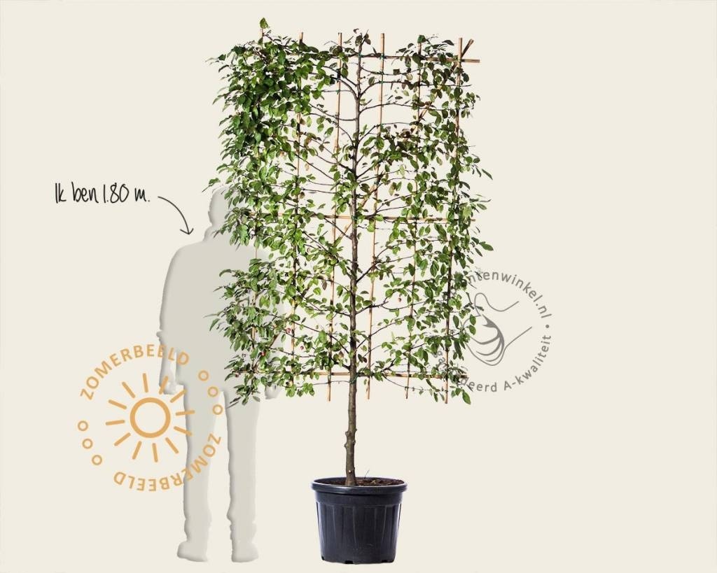 Deze Lei-scherm uitvoering kan worden gebruikt om kamers in uw tuin te creëren, een muur of schutting te camoufleren of juist om het zicht af te blokken vanaf de straatzijde. De Lei-Malus 'Evereste' heeft een korte stam van 50 centimeter met daarboven een scherm van 120 x 180 centimeter. Het frame kan worden vergroot door parallel extra bamboestokken aan te binden. U kunt de kluit van de boom tegen de schutting aan plaatsen, maar bij voorkeur plaatst u de stam op een afstand van minimaal 40 à 50 centimeter of meer.
