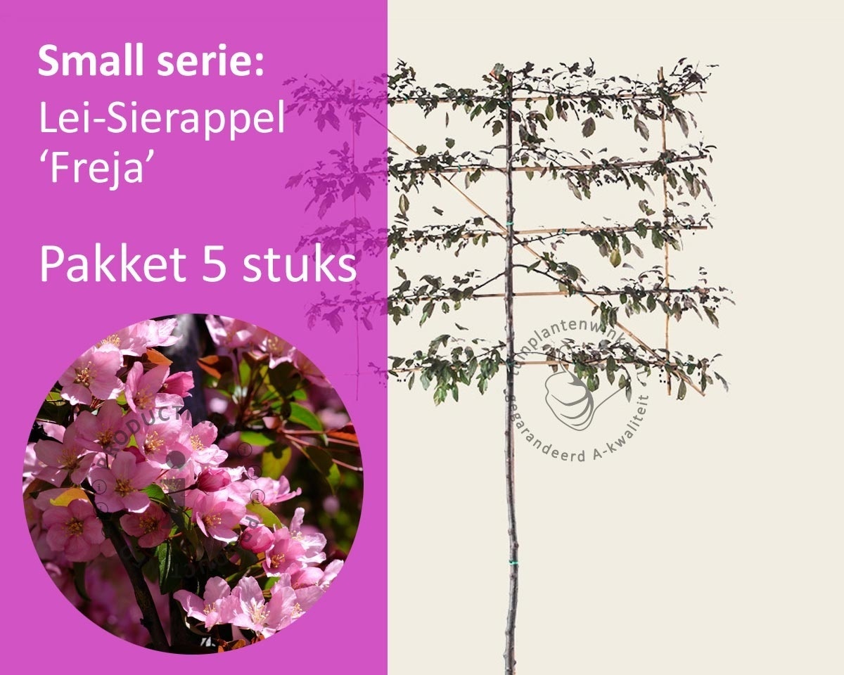 De kleinere leibomen uit de Small-serie komen het beste tot hun recht in bijvoorbeeld de voortuin, om de 'kijk' in het huis weg te nemen, of tegen de schutting. Tegen de schutting breekt het de eentonige afscherming. Deze Lei-Sierappel toringo 'Freja' is hier uitermate goed geschikt voor. Met zijn bloesem in het voorjaar, rode bladeren in het voorjaar en zomer en vruchtjes vanaf eind zomer t/m eind winter is er altijd iets van kleur te vinden aan deze leiboompjes.
