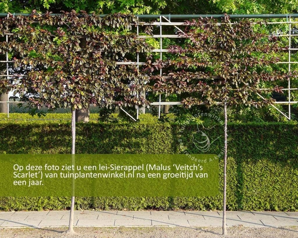 Lei-Malus 'Veitch's Scarlet' komt het best tot zijn recht als hij geplant wordt ter decoratie (bloesem / vruchtjes). Voor het bieden van totale privacy is hij minder geschikt, omdat de Lei-Sierappel altijd een beetje gefilterd open blijft. Lei-Sierappels worden om deze reden veel toegepast in de voortuin waar het bieden van privacy vaak minder van belang is. De Lei-Malus 'Veitch's Scarlet' is een van de leibomen uit ons uitgebreide assortiment.