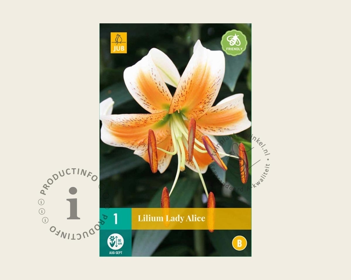 De Lilium 'Lady Alice', een betoverende verschijning in elke tuin, staat bekend om haar opvallende bloemen die een elegant contrast bieden tussen zachte abrikooskleurige tinten en rijke, oranje accenten. Deze variëteit, vaak aangeduid als de 'Lady Alice lelie', is een must-have voor liefhebbers van bijzondere tuinplanten. Met haar grote, trompetvormige bloemen en een hoogte die kan variëren tussen de 90 en 120 cm, is de 'Lady Alice' een opvallende verschijning in borders, perken of als solitaire blikvanger.